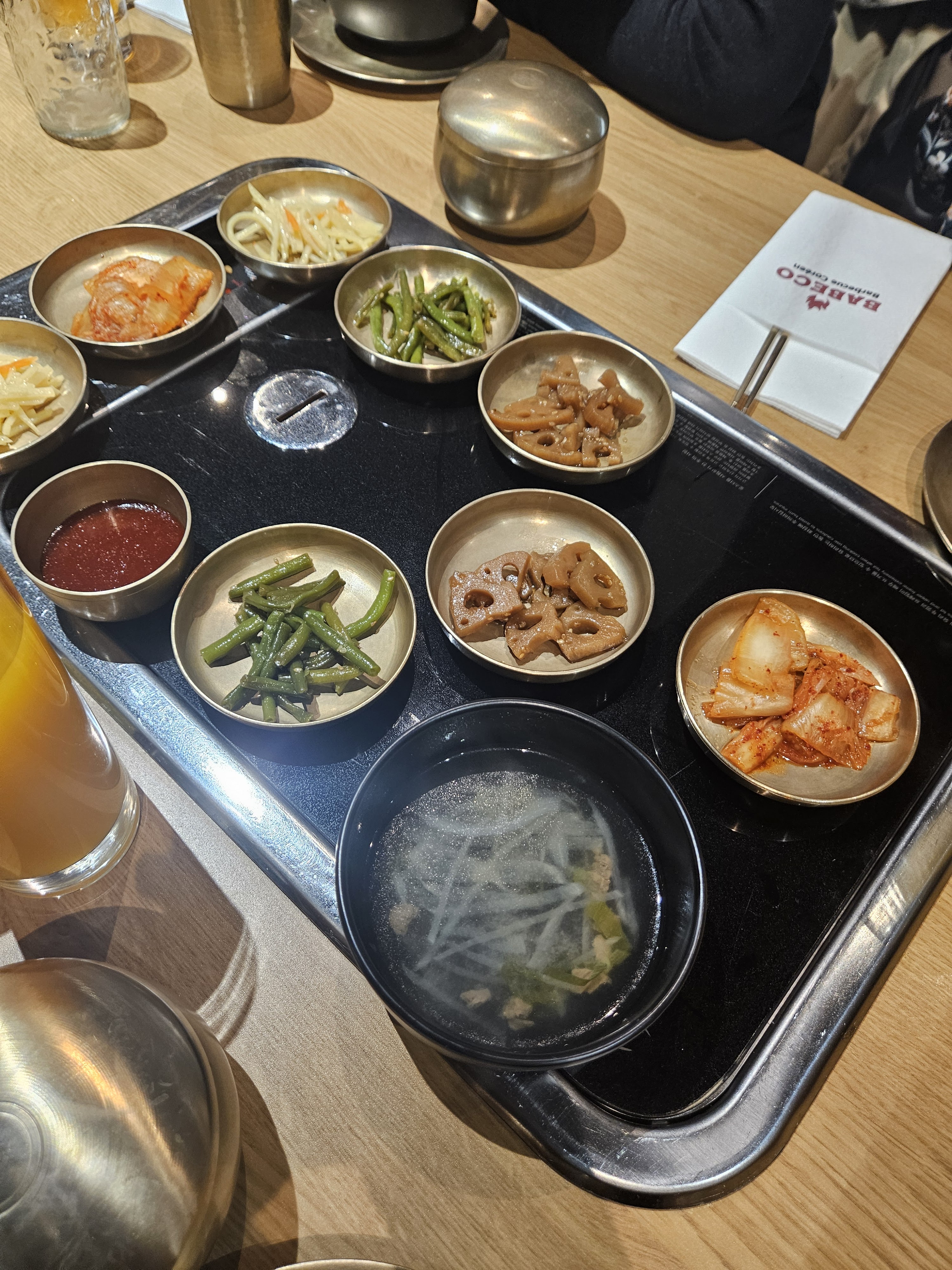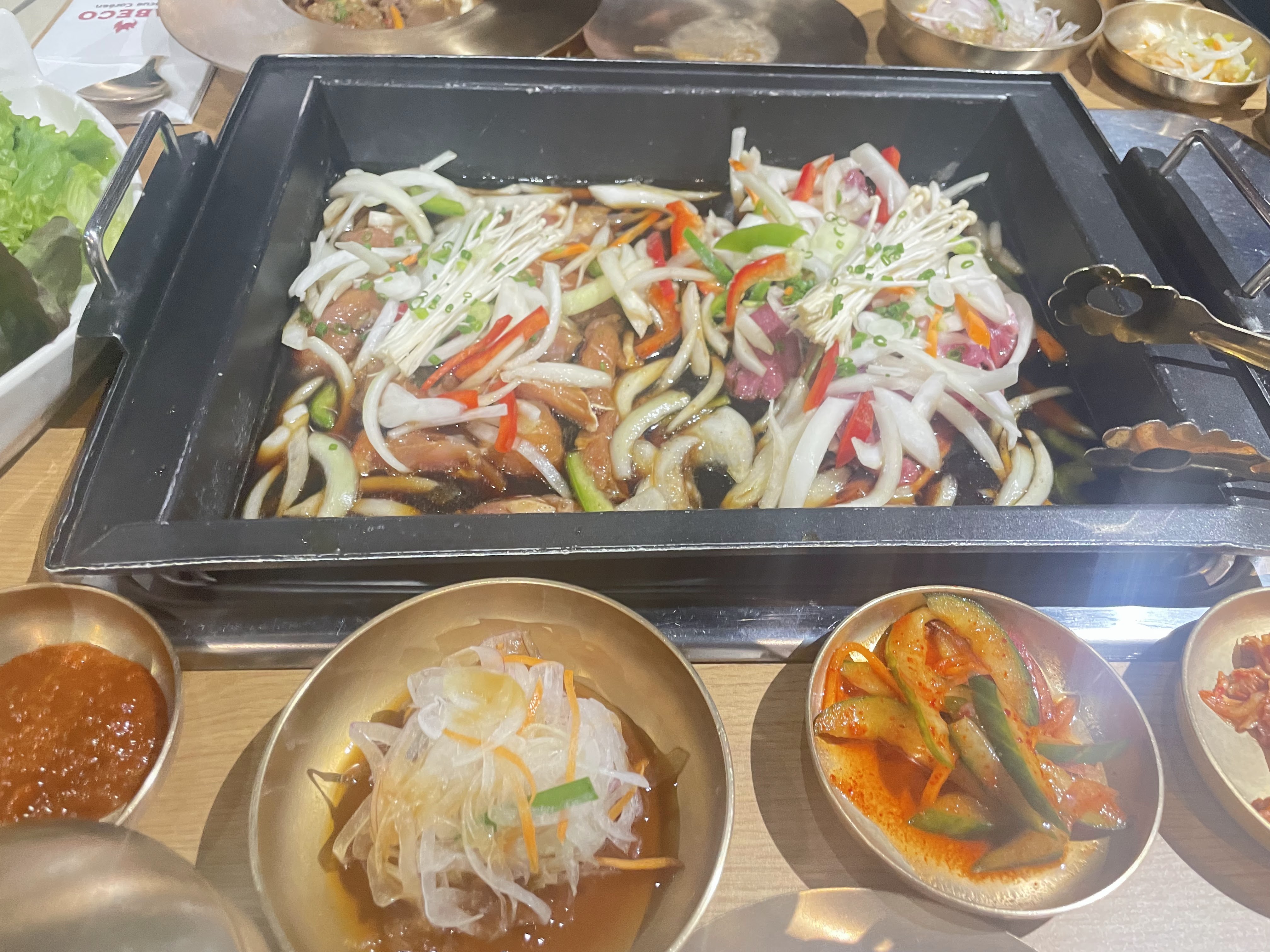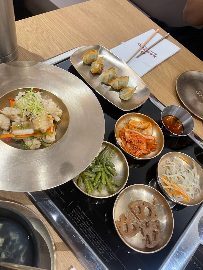 Au début je le disais que les prix étais un peu chers pour ce que c'est, vu que la Corée est un peu à la mode jme suis que c'était pour ça mais en vrai je recommande!!! Les portions sont enormes(barbecue) appart les gyoza en entrée qui sont vraiment minuscule. Pour les Barbecue vous à avez 2 énormes tranches de bœuf qui sont roulés, l'assaisonnement est délicieux👌🏾👌🏾. Je vous recommande de prendre le japchae en entrée (nouilles transparente au bœuf) c délicieux, avec tout cela vous avez plein de condiments! Un bol de riz,du kimchi epicé ,des haricots vert, des onions sauce moutardes miel,des concombres marinés, une salade de choux, des patates douces,des chanpignons et de la salade!!!!La plancha est bonne aussi mais je recommande vrmt le barbecue .Les menu sont vraiment complet. Même si les prix sont un peux élevé (39€ le menu barbecue en août 2024) on en pour notre argent👍🏾👍🏾👍🏾