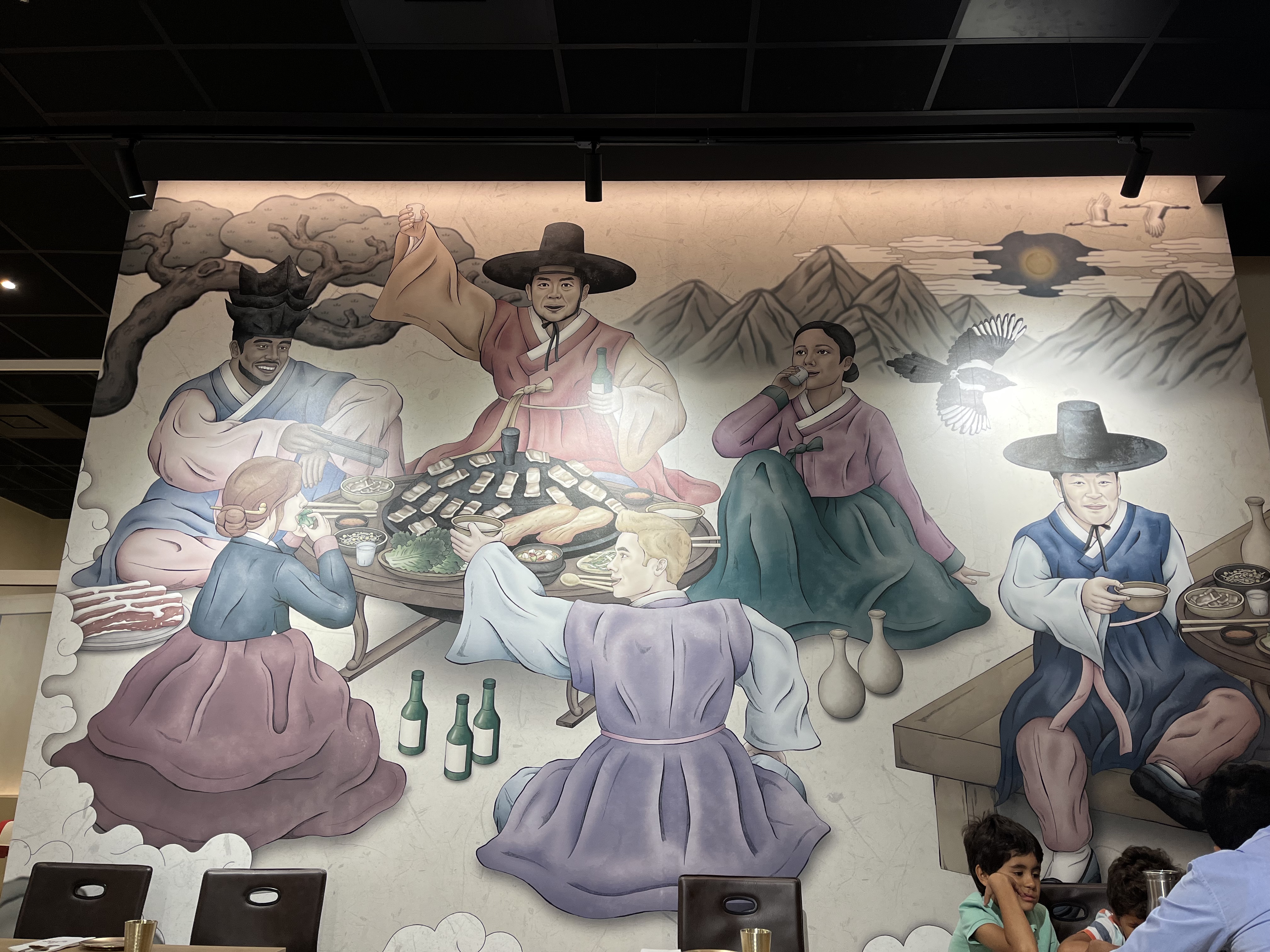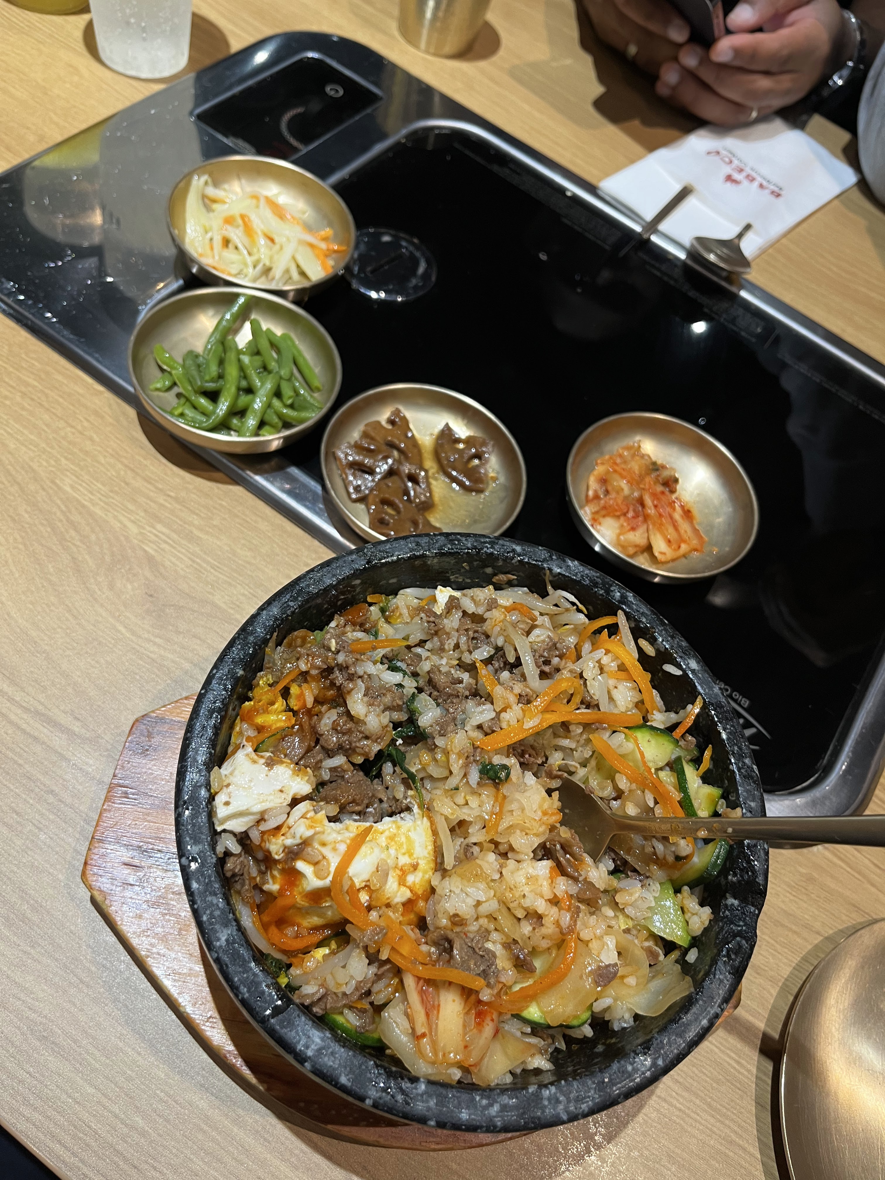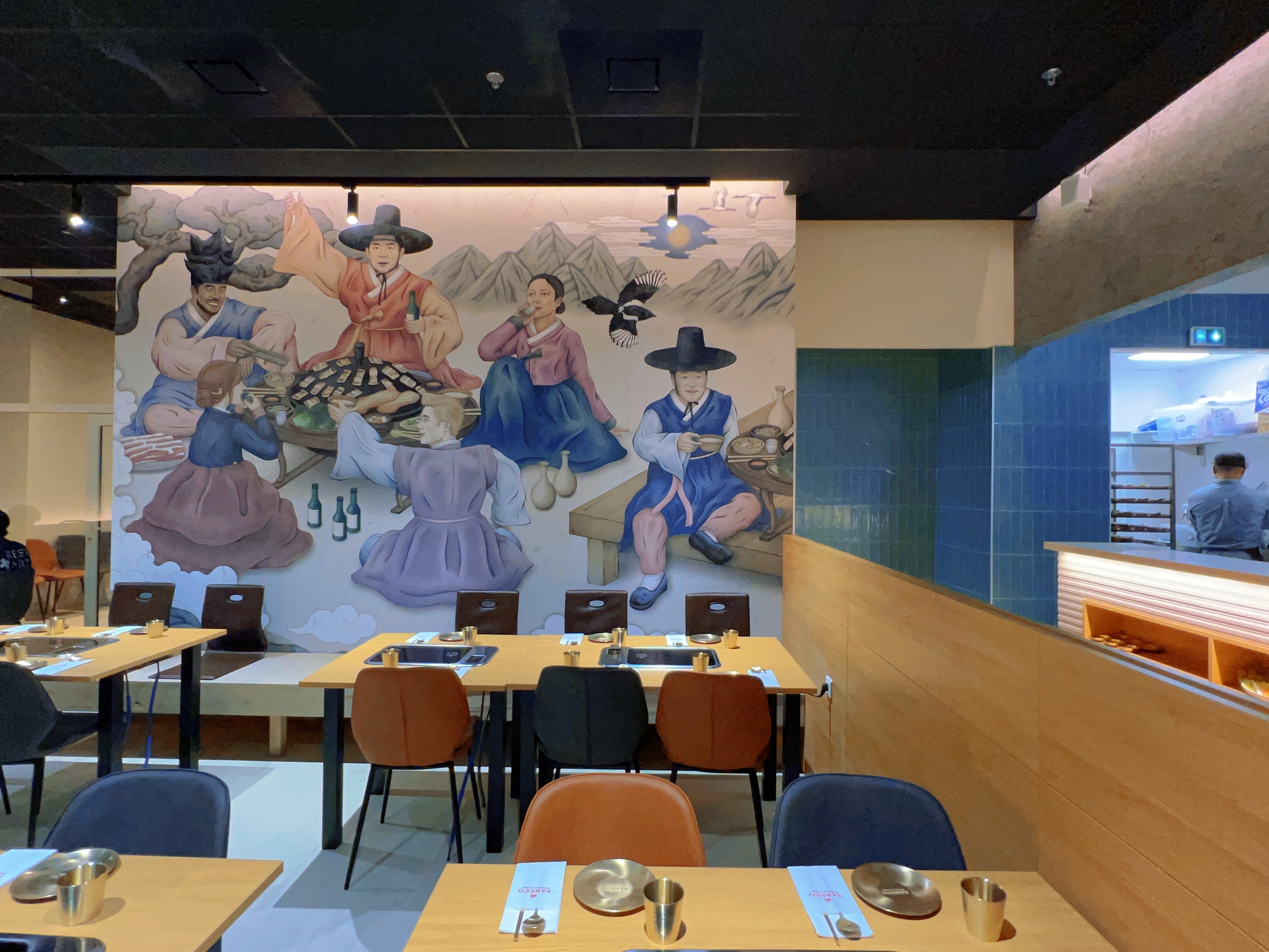 lieu à la décoration sympa. les serveurs sont agréables mais pas toujours disponibles quand on a besoin. la nourriture est bonne et le dessert tiramisu thé sert exquis . par contre, j’aurais préféré de la viande bovine en morceaux et non hachée et en plus grande quantité dans le bibimbap. le règlement par qr code est pratique mais des frais d’utilisation de l’application s’appliquent.