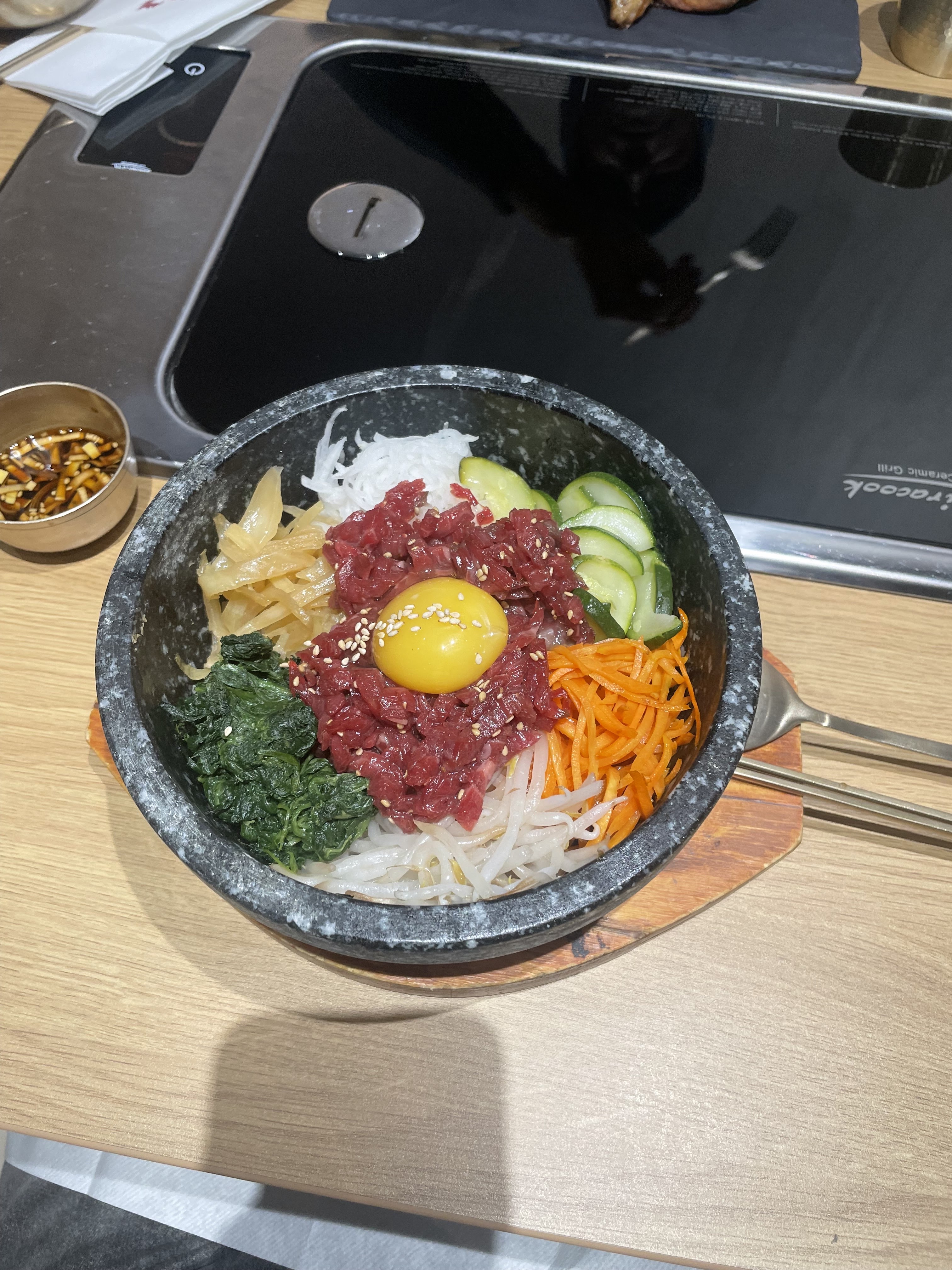 La nourriture était bonne nous avons choisi un barbecue de bœuf coréen . C’était bon mais les condiments vraiment trop trop léger . Et le riz à payer en plus ça revient trop cher. Cela devrait faire partie du menu qui est déjà chère de base. L’accueil pas terrible , on attend devant pendant 10 minutes, les serveurs passent et nous regardent sans adresser un mot . Du coup on a pensé qu’il fallait qu’on s’installe et lorsqu’on a pris l'initiative, un serveur est venu nous le reprocher …. La nourriture était de qualité et une serveuse très souriante et serviable est venu nous proposer de l’aide avec le barbecue. Globalement une bonne expérience mais vraiment dommage que la quantité de nourriture soit aussi limité compte tenu du prix