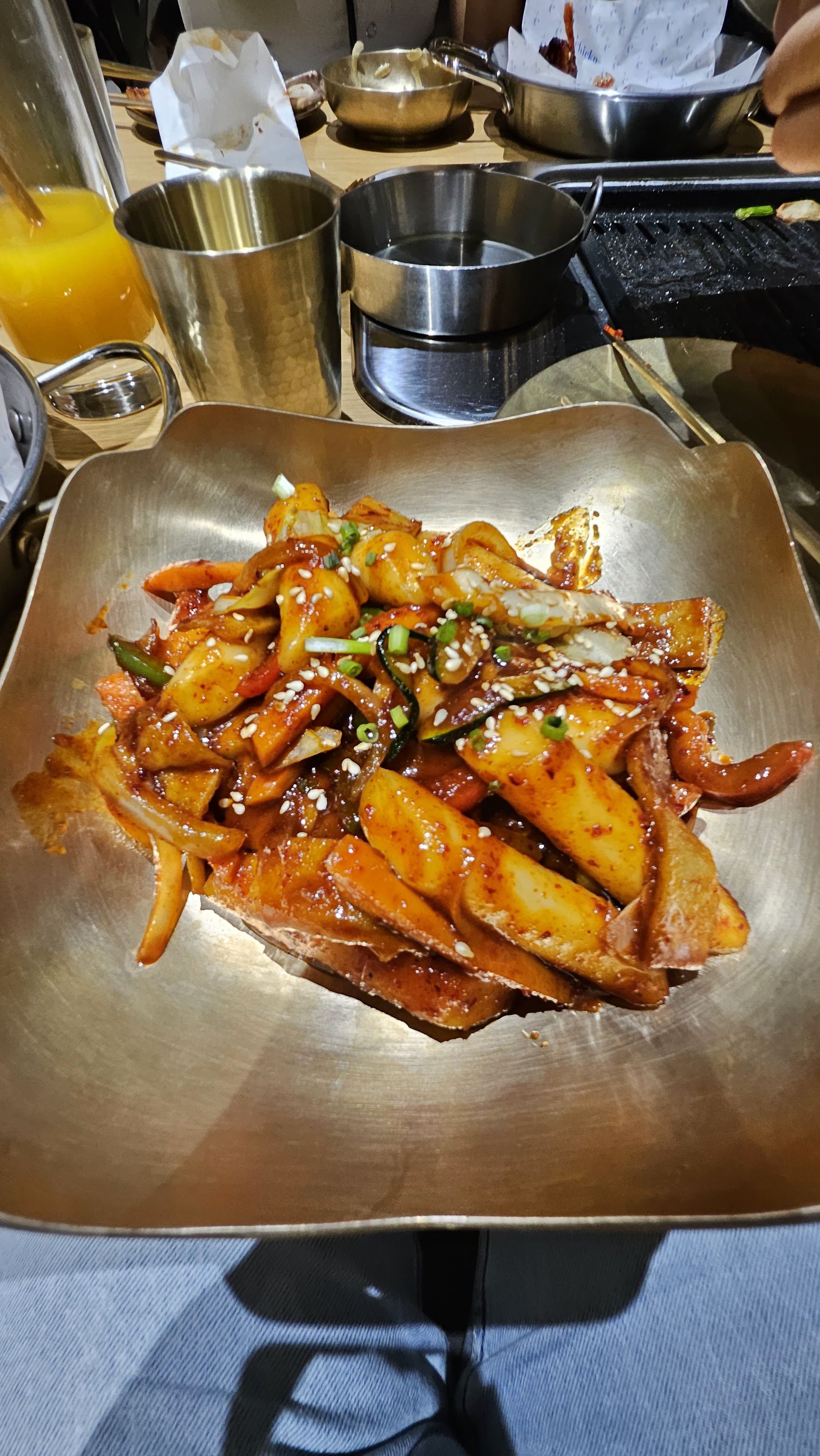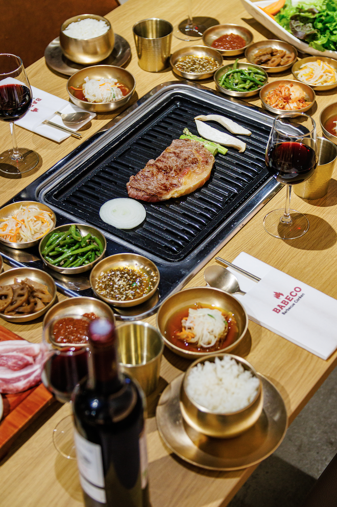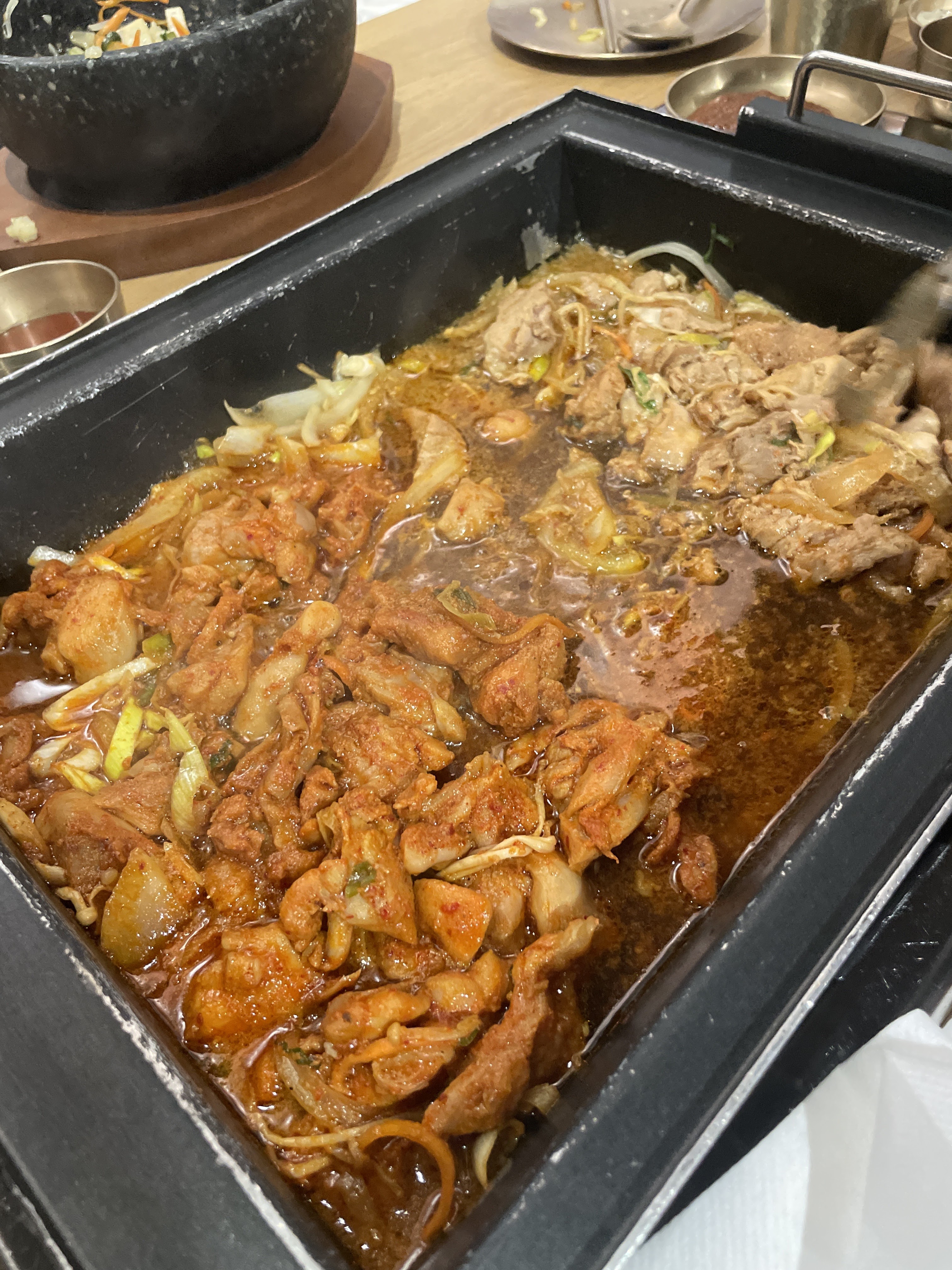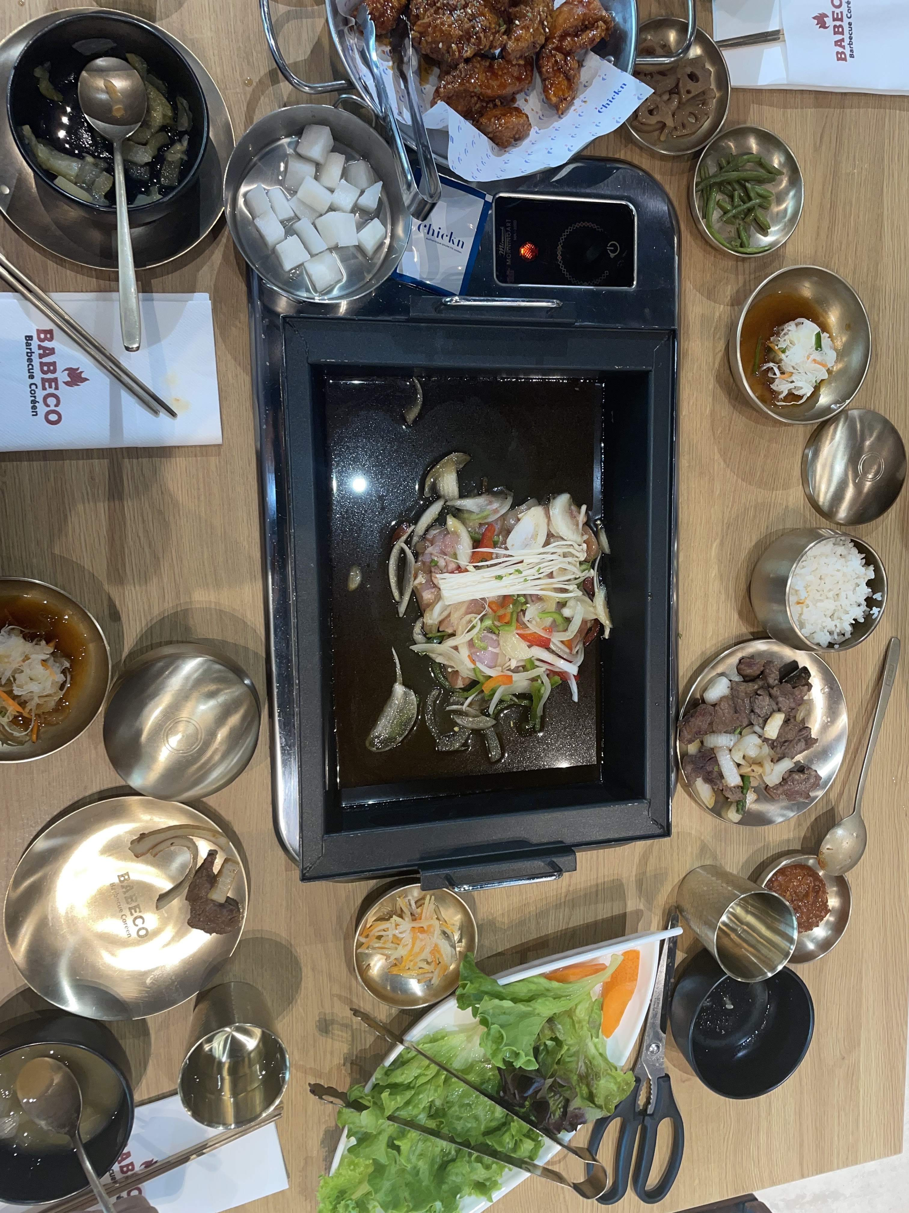 Super moment autour d'un barbecue coréen. Poulet cuit par un bras robot. Barbecue super bon onglet marine et porc mariné, dommage que le porc soit trop épais.
