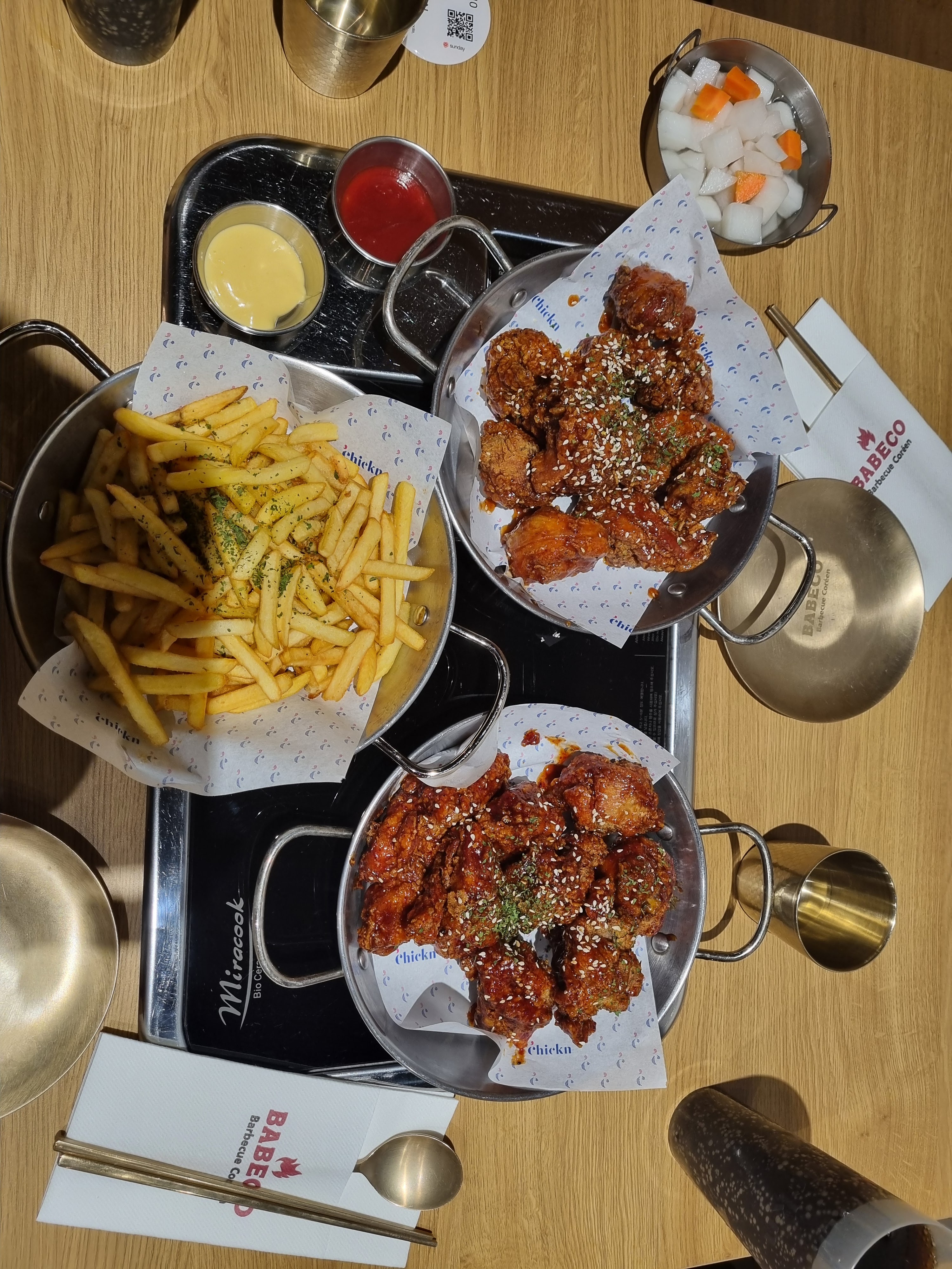 Restaurant très joliment décoré. Les poulets frits sont vraiment excellents, croustillants mais très tendre à l'intérieur et la sauce hot and sweet est vraiment bonne (portion généreuse). Le JapChae très bon et très bien présenté. Les côtés négatifs sont la musique qui était un peu trop forte (je ne sais pas si c'est parce qu'on était au fond de la salle) et la quantité de viande pour le barbecue est vraiment trop petite par rapport au prix payé.