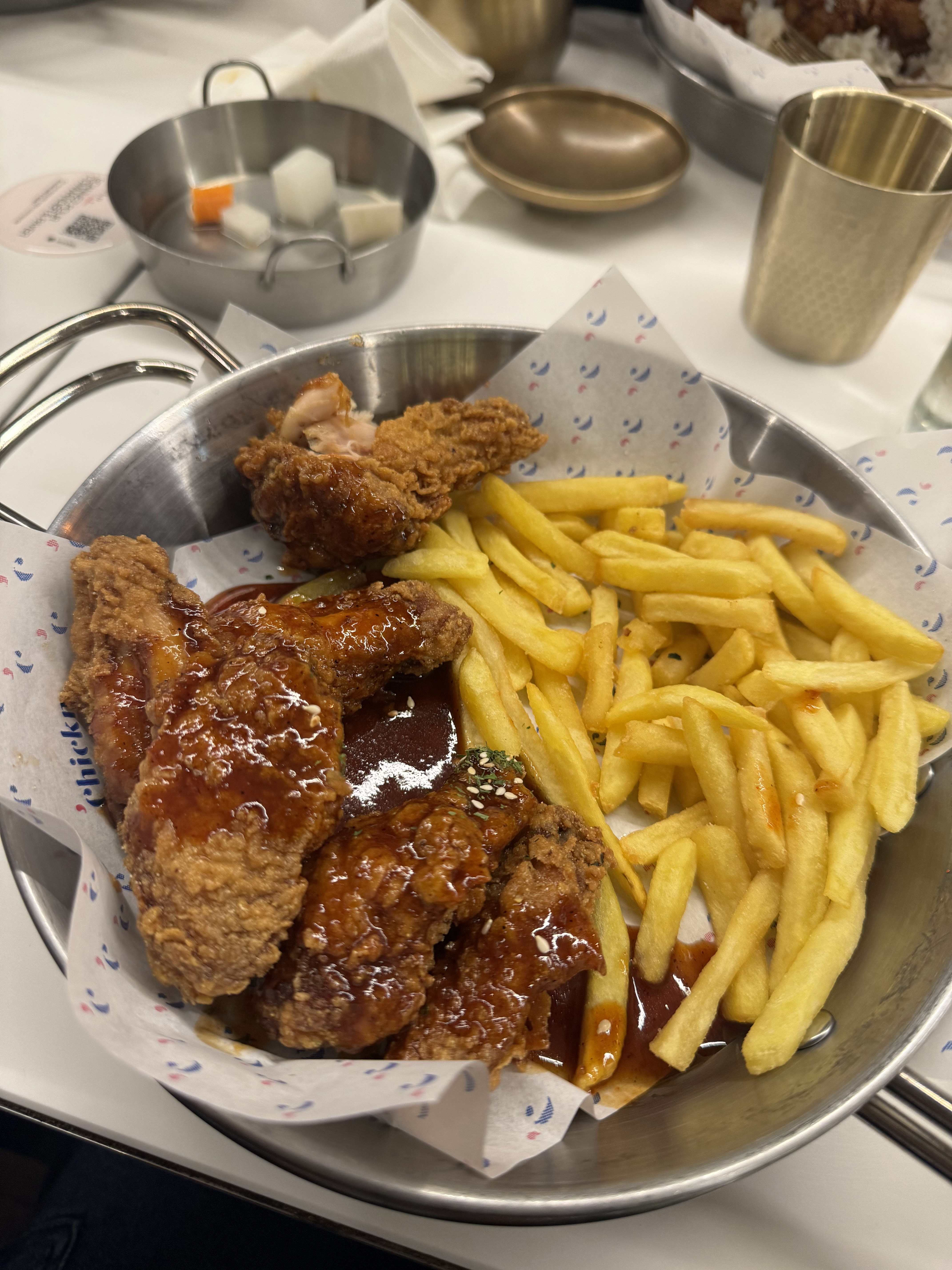Poulet Coréen digne de ce nom: pilon, tenders ou wings marinés correctement, avec ce croustillant caractéristique qui temoigne de la qualité. La concurrence local a emporter ne fait pas le poid. Le service est sympa et accueillant. Une référence.