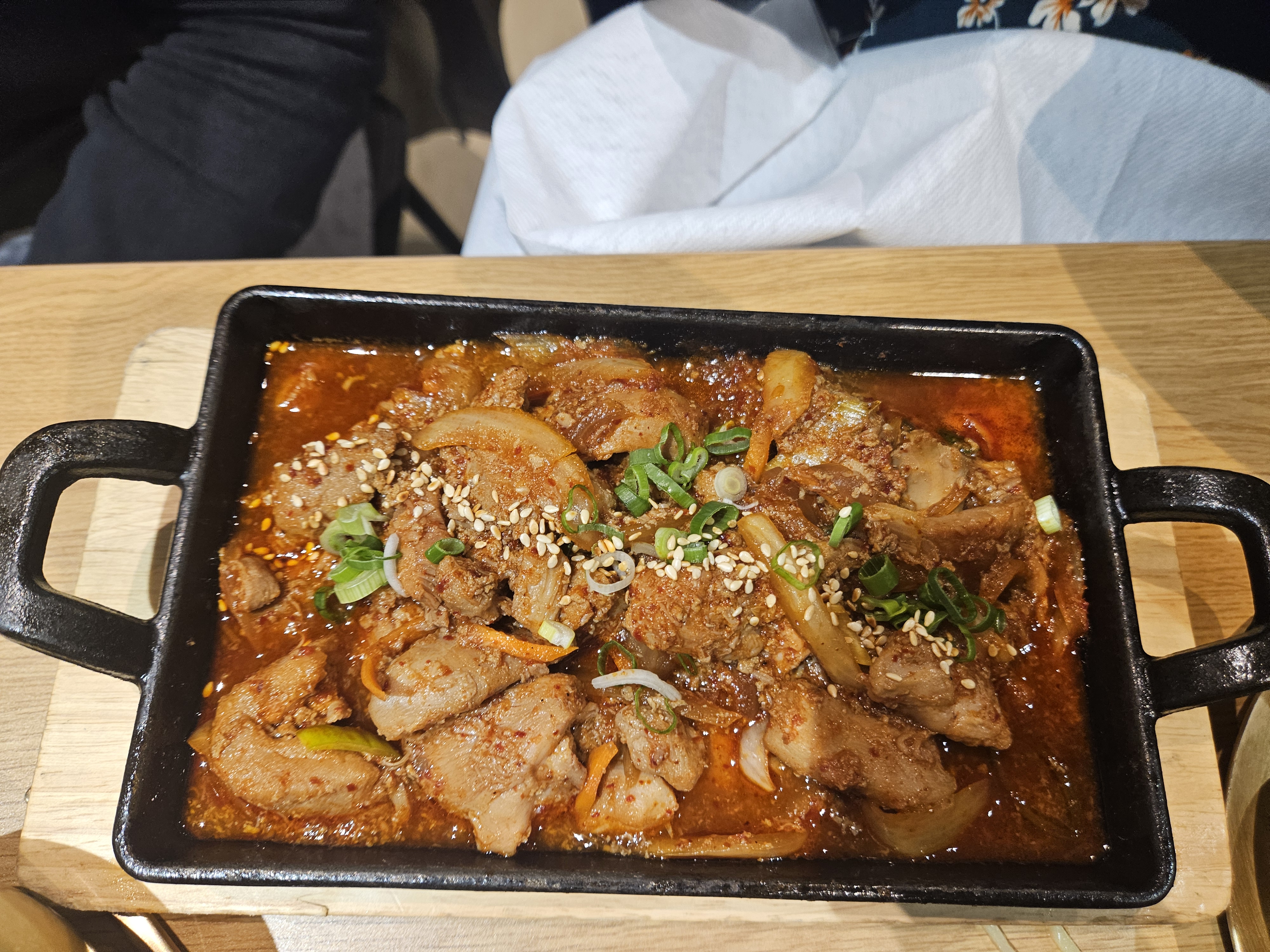 Restaurant coréen plutôt bon. A faire au moins une fois. - l’ambiance est cozy et plutôt calme - le personnel est aux petits soins - le service est rapide On nous a servis une soupe en entrée, je ne sais pas si c’est compris dans le menu. Nous avons pris du bœuf en barbecue coréen . C’est le serveur qui mets la viande sur grille. C’est accompagné de légumes et de sides (voir photos). Au niveau de la quantité, c’est trop peu, et le prix est trop élevé (31€ min), donc ça n’en vaut pas la peine. Nous avons également pris du poulet frit façon coréen (29€ pour 2pers) avec la sauce red (sweet & hot) et ca a été une vrai découverte, au niveau goût c’est excellent ! Les softs sont servi dans des grands verres, c’est top