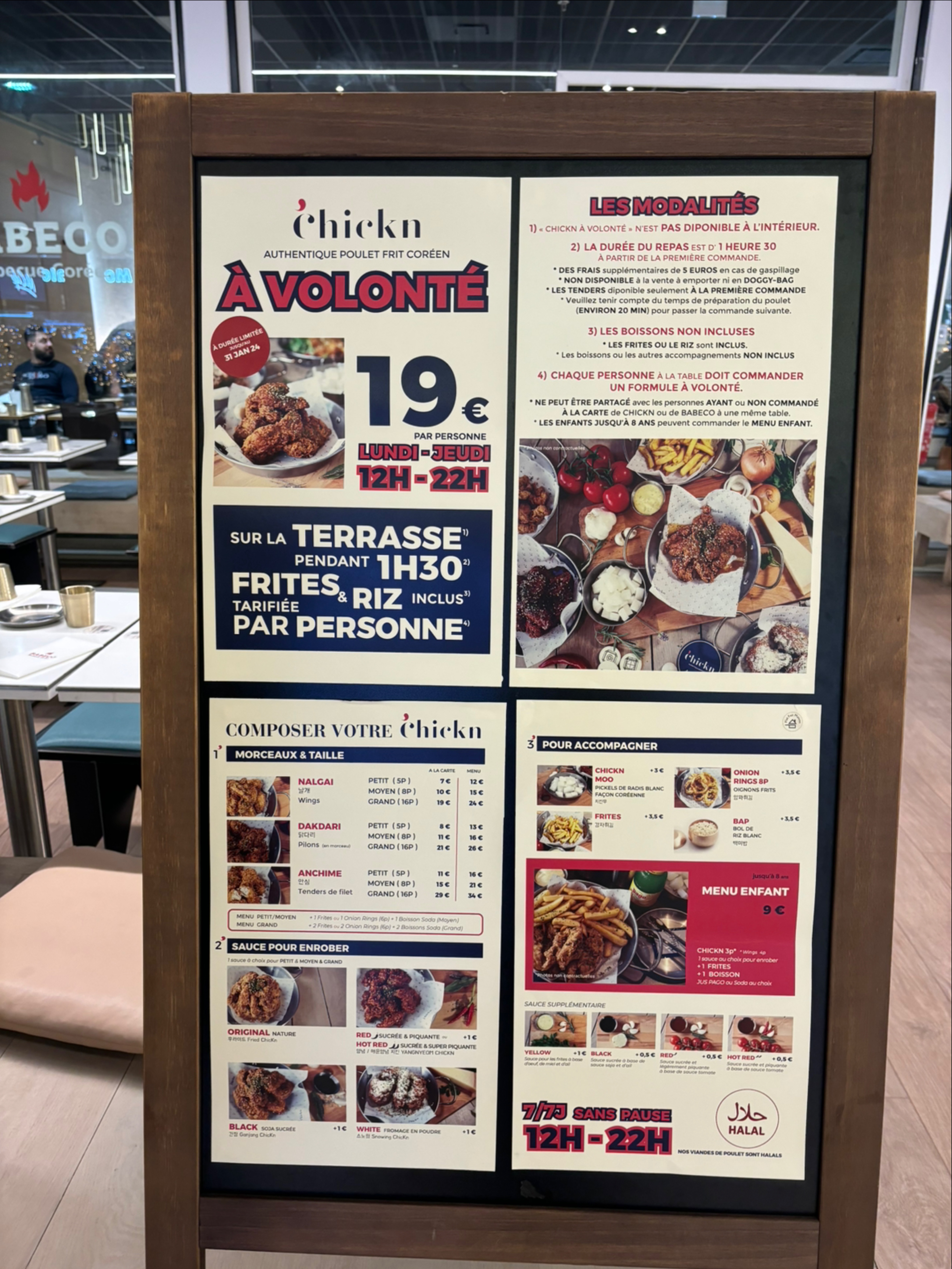 Bon... On va commencer par les bons points : Les poulets frits sont bons (heureusement) Maintenant, le service est très nonchalant, le serveur nous explique à moitié comment se déroule le menu à volonté avec un ton comme si c'était mon père qui essayait de me faire comprendre des maths. J'ai demandé de changer ma commande au même moment où il l'a prise et il me dit de prendre ce que je voulais changer à la prochaine tournée ??? J'ai pas osé forcer pour pas trop l'embêter non plus. Premier service rapide, deuxième service très long. À propos de l'ambiance du menu à volonté : c'est un escape game, vous êtes pressé par le temps imparti, vous devez finir votre assiette sous peine d'une sanction de 5 euros, prévoyez 20mn à chaque commande. Les règles du jeu et le gamemaster m'ont dégouté de BABECO. Décoration originale et grand espace cela dit. Pour ceux qui souhaitent prendre un menu à volonté Chickn : si c'est le serveur à lunette un peu grincheux, pliez vous à ses ordres sinon il va vous punir, mais savourez quand même le poulet parce qu'il est bien fondant