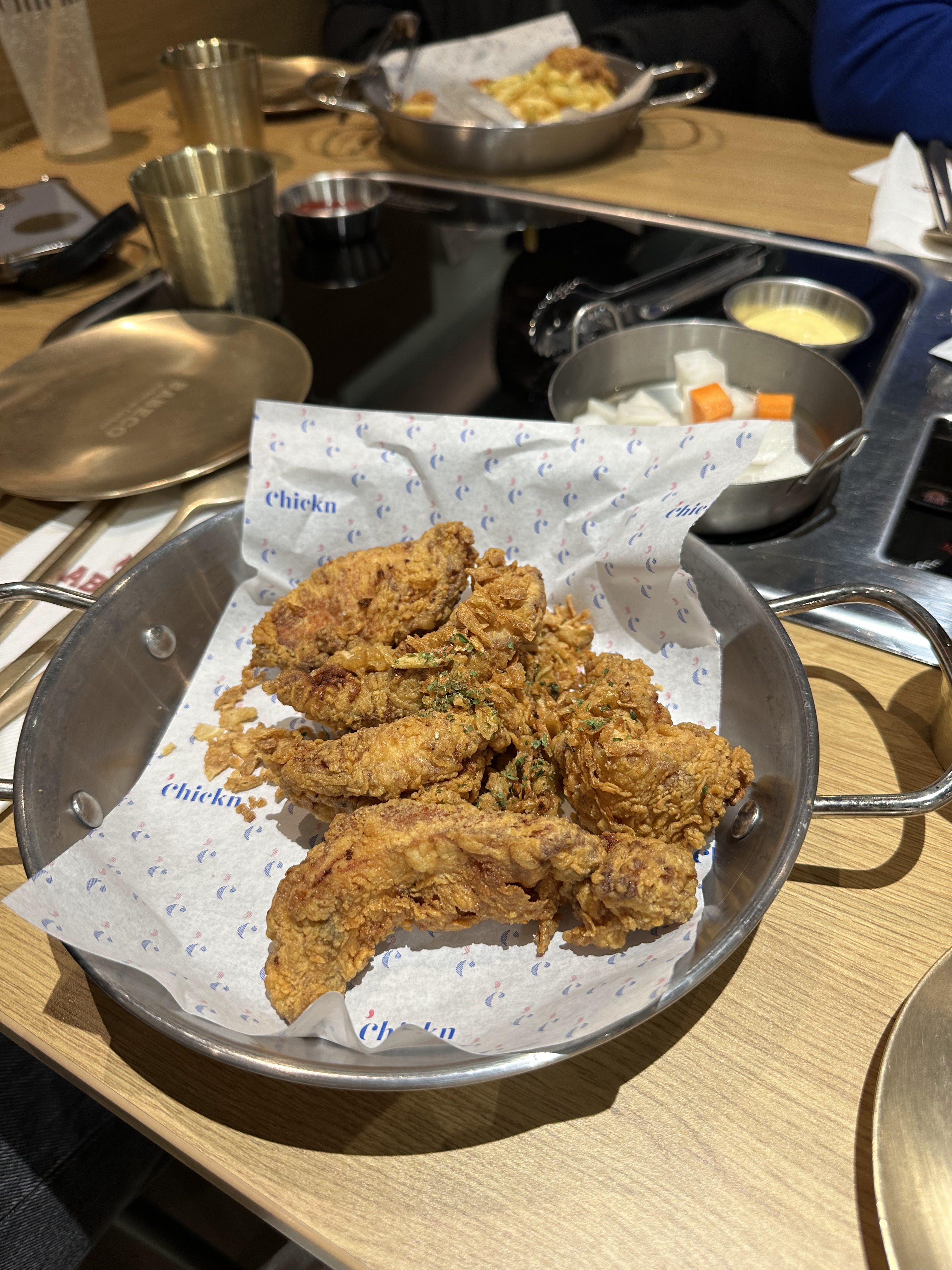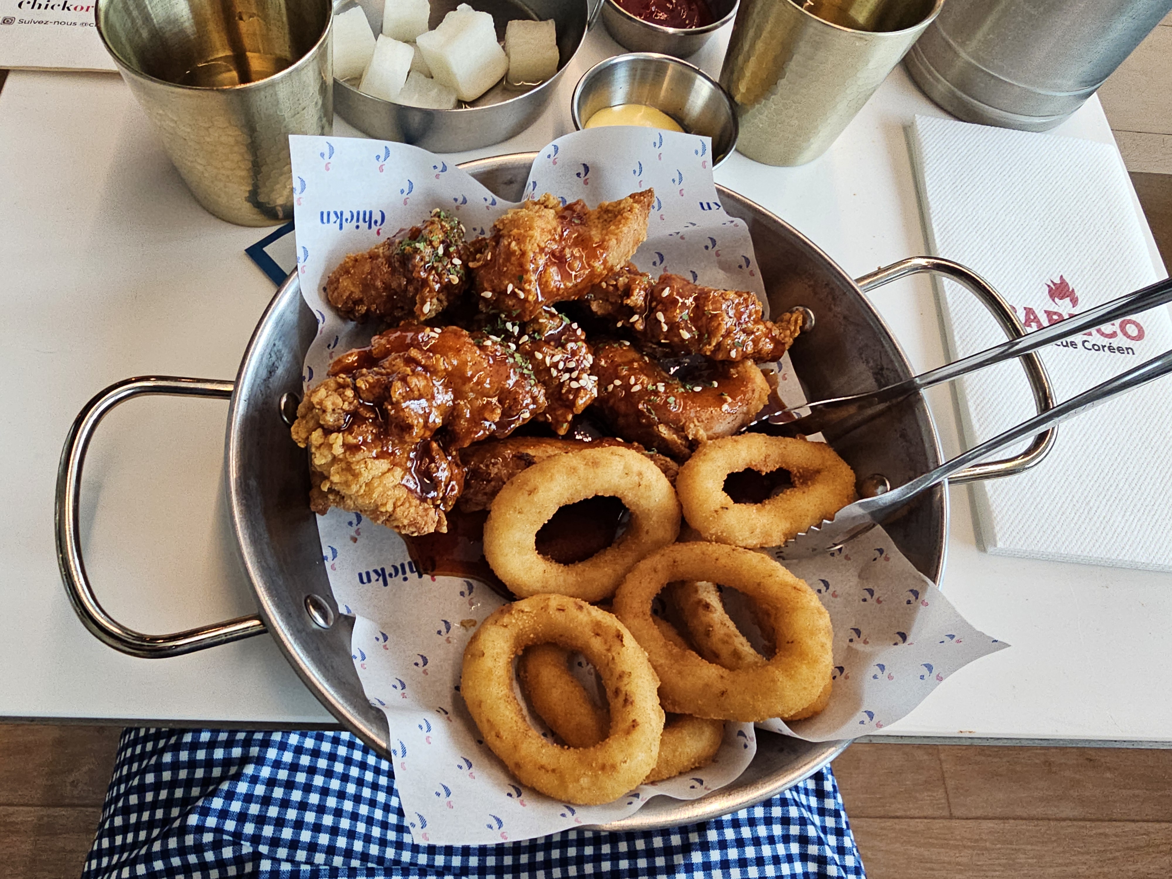 Nous n’avons vraiment pas la même définition du « à volonté » Il y a seulement 2 tournées , beaucoup trop de restriction : pas le droit de prendre de tenders pour la 2e tournée ni d’oignon rings Les sauces ne sont pas ouf, on nous as servit 2 petite sauce ketchup mayo pour 4 personnes ??? Le poulet frit est mangeable mais sans plus Assez déçu autant allez au kfc Quant à la partie plat coréen nous n’avons pas pu testé parce qu’on devait tous prendre la formule « a volonté » ils ne nous ont pas laissé le choix.