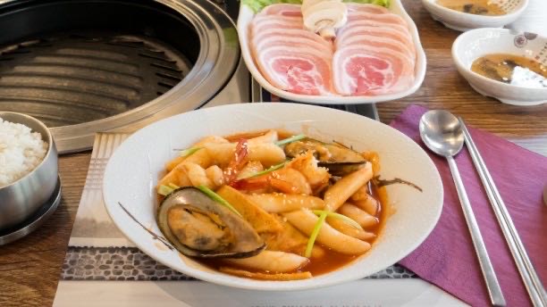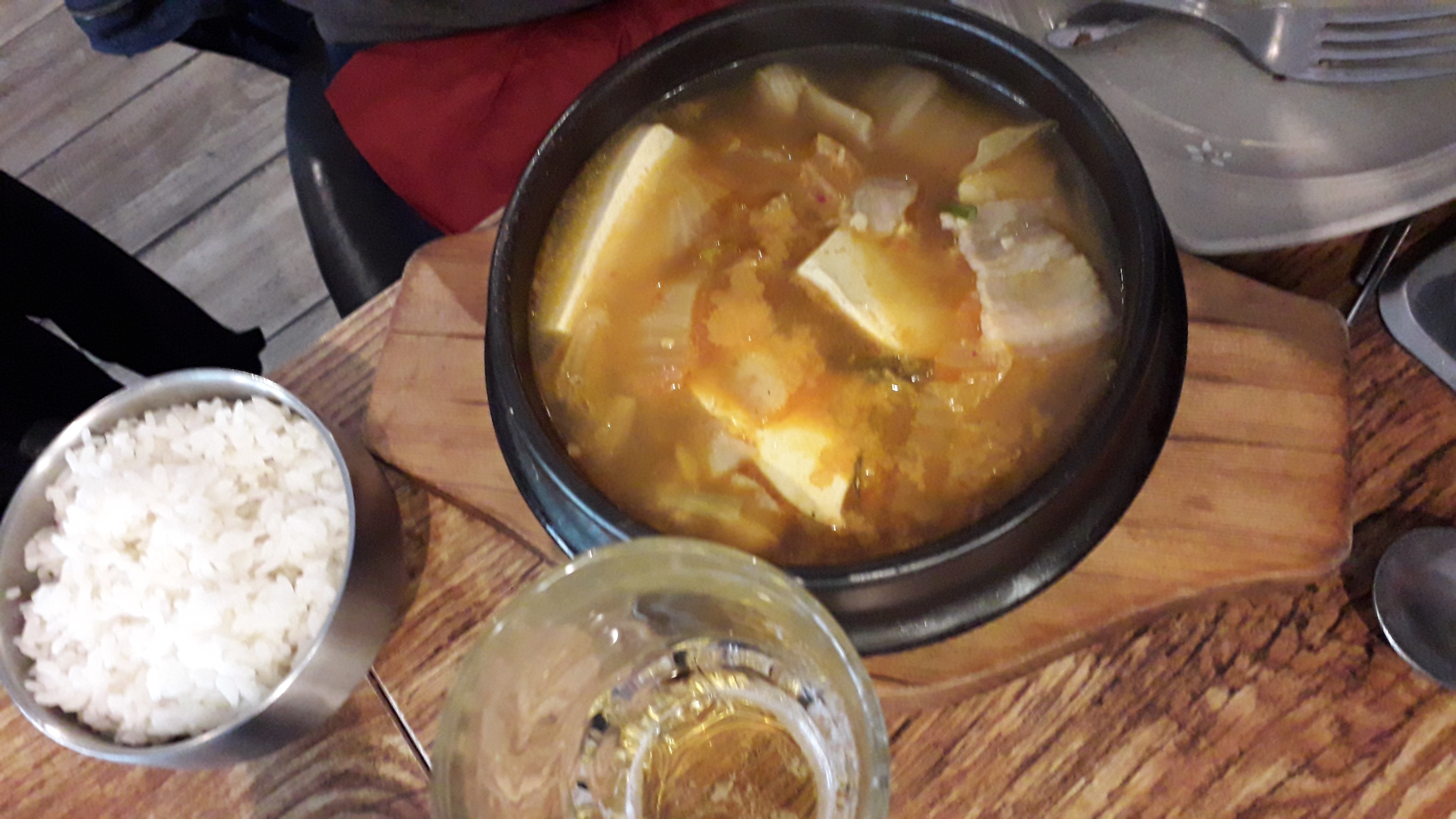 Le tteokbokki aux fruits de mer à la sauce piquante est excellent et le ragoût de pâte de soja est très parfumé (le bol en pierre permet de garder la chaleur pendant toute le repas).