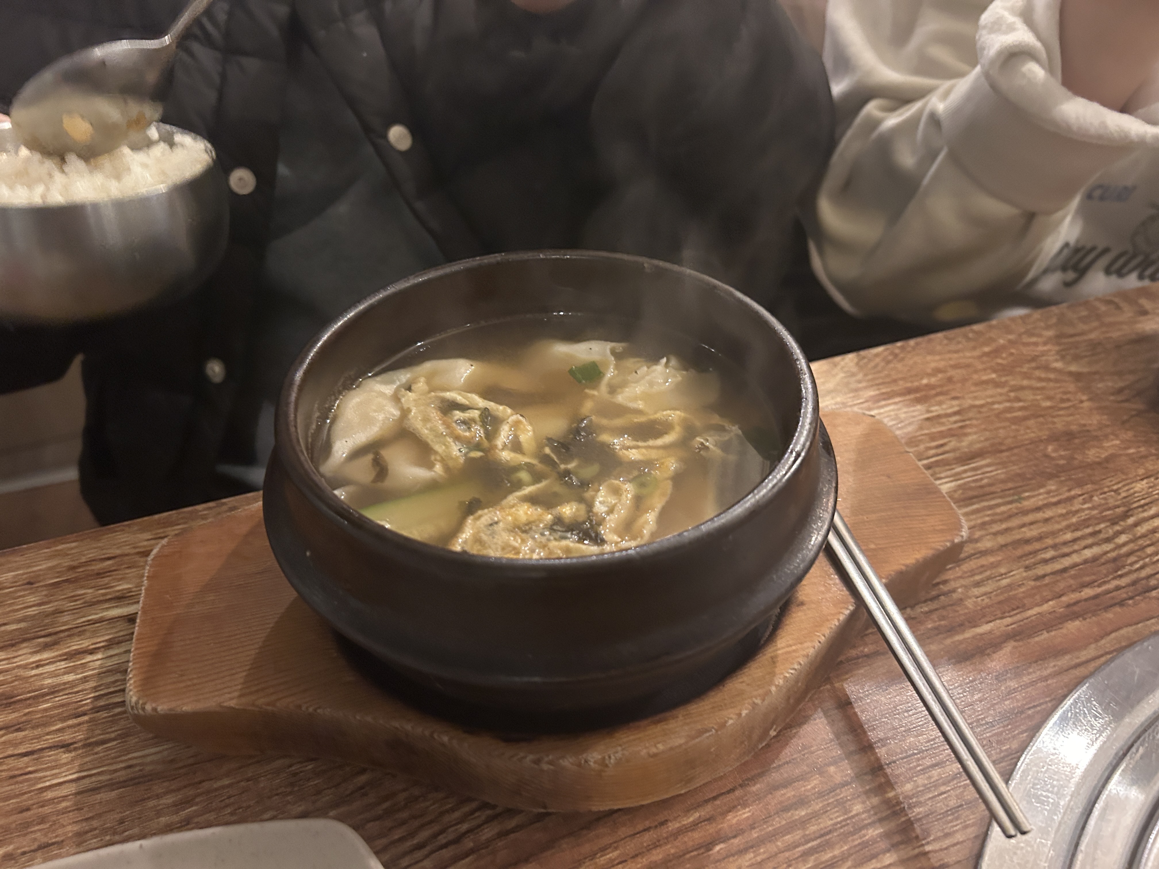 Personnel sympathique. Cuisine excellente, nous avions pris un ragoût de kimchi et une anguille grillée. Salle un peu mal isolée si vous êtes placés vers l'entrée du restaurant, il fait assez frais en cette période d'hiver. Petite salle mais propre.