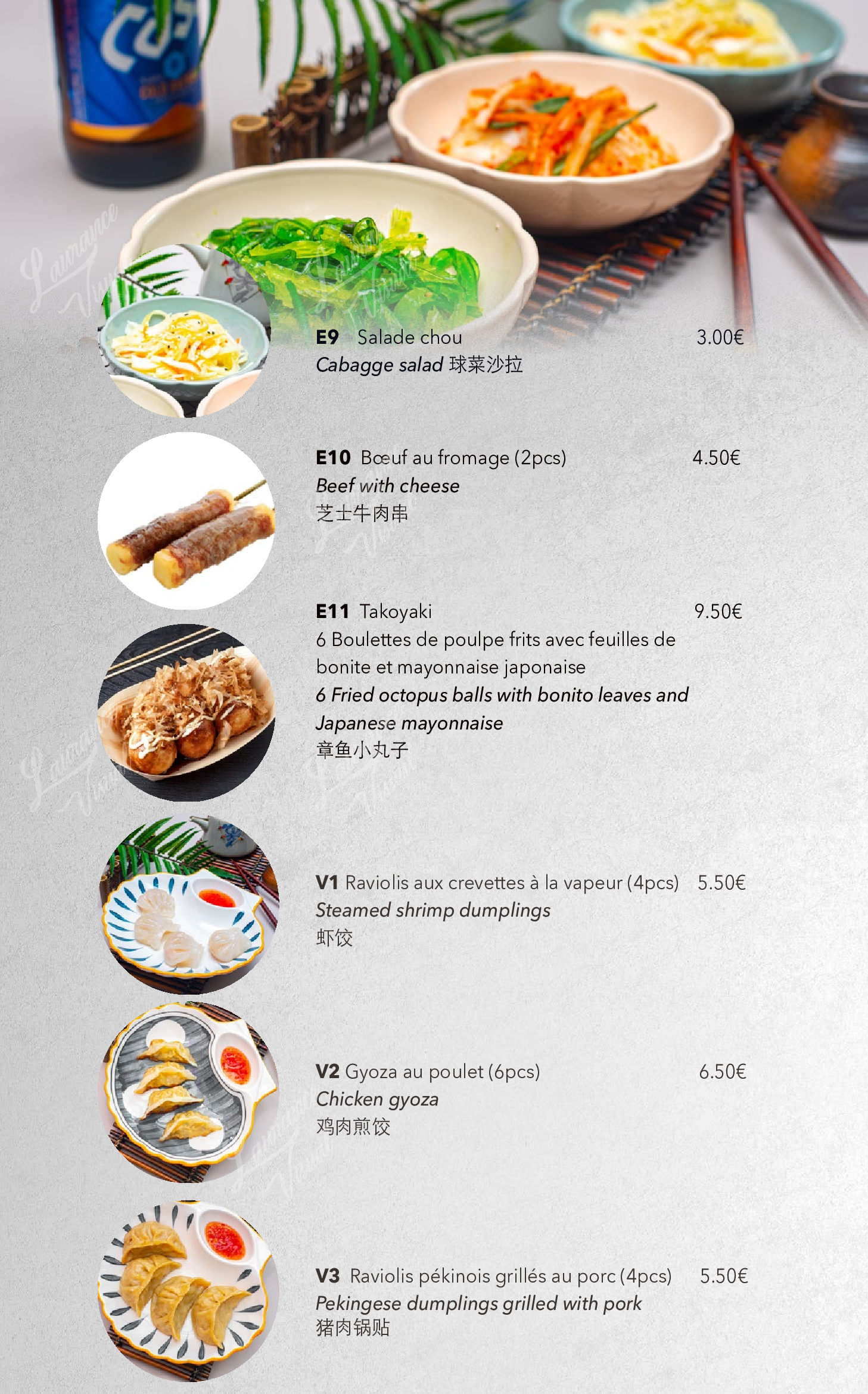 Fortement recommandé : poulet au fromage, boulettes de viande de poulpe, brochettes de bœuf au fromage, agneau, soupe de bœuf coréenne