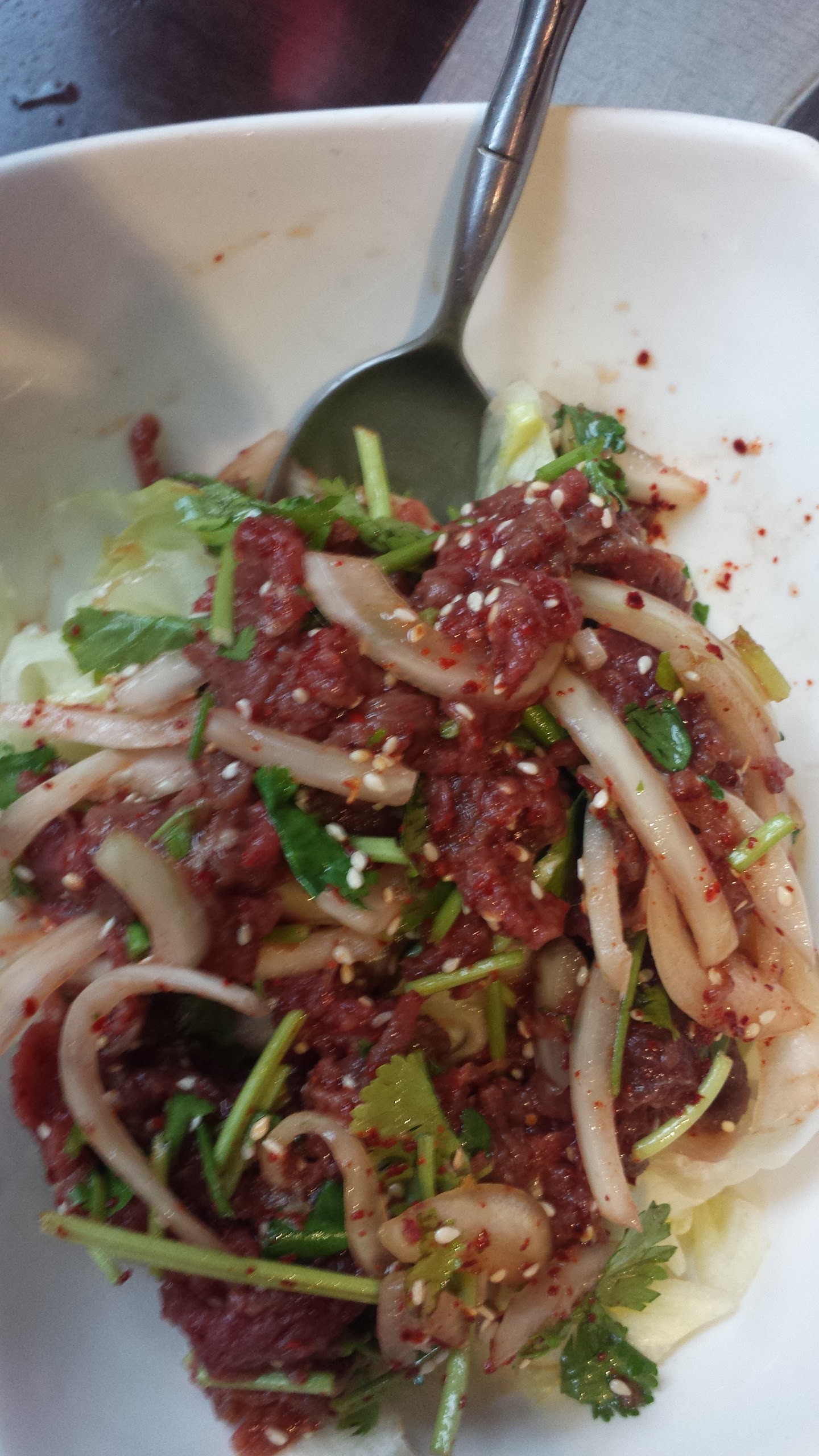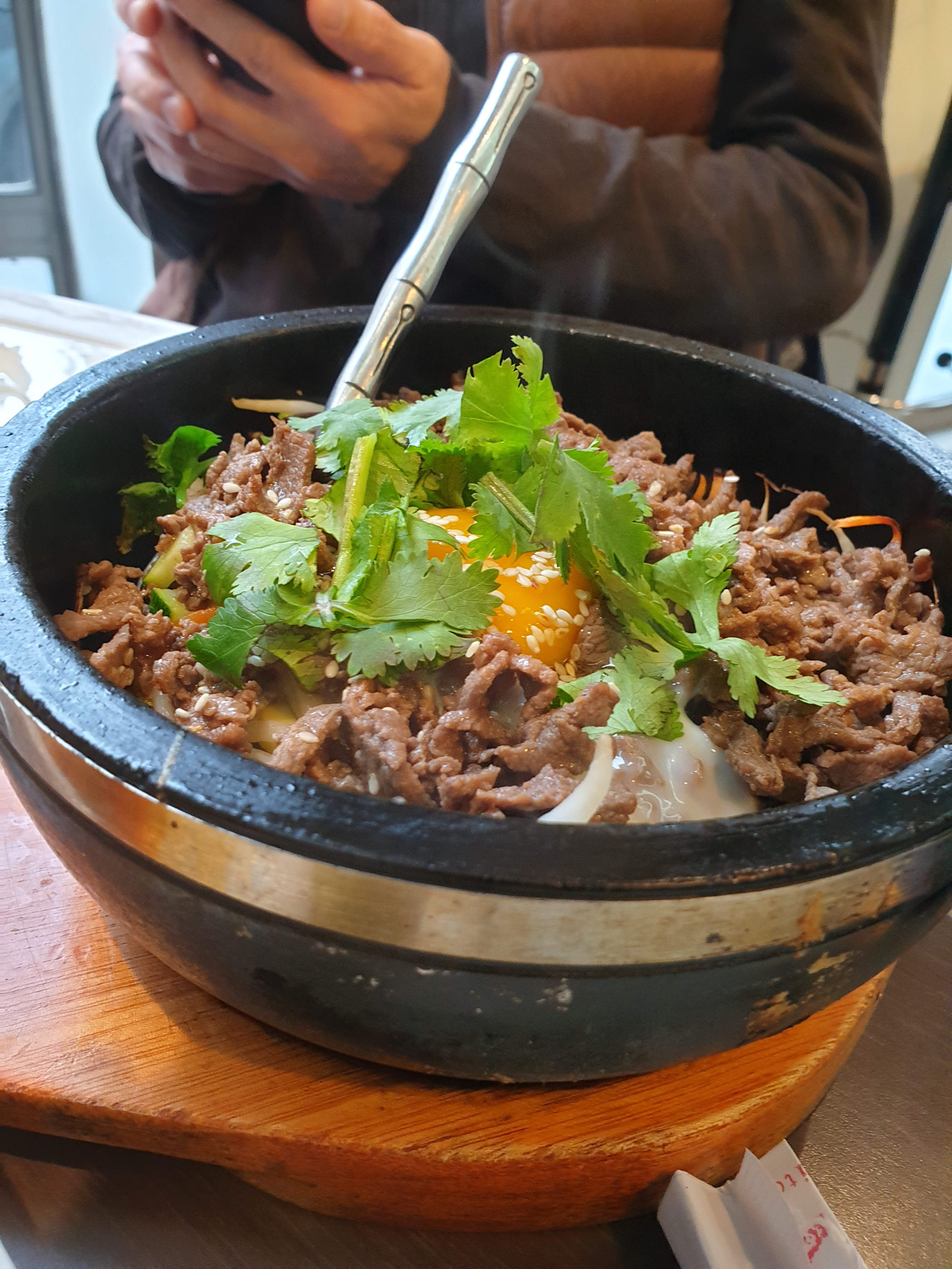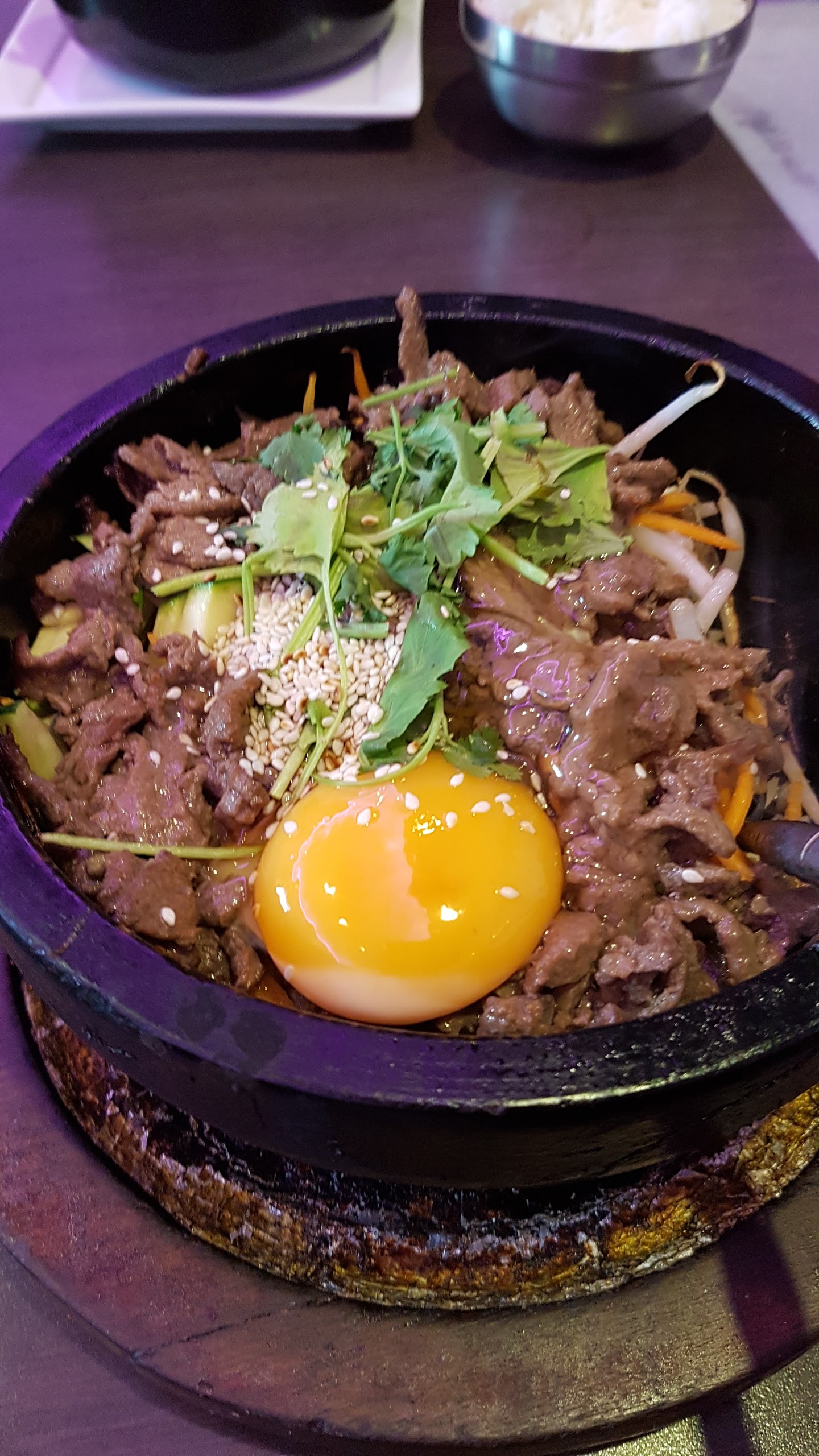 Je m'attendais à bien mieux, ce n'est pas le meilleur bibimbap que j'ai mangé. Qualité peu convaincante de la viande de bœuf (un peu chewing-gum) et quantité beaucoup trop important comparé au reste du plat. Au vu de la qualité un peu médiocre de la viande, un bibimbap végétarien aurait permis d'éviter une déception, le reste étant bons.