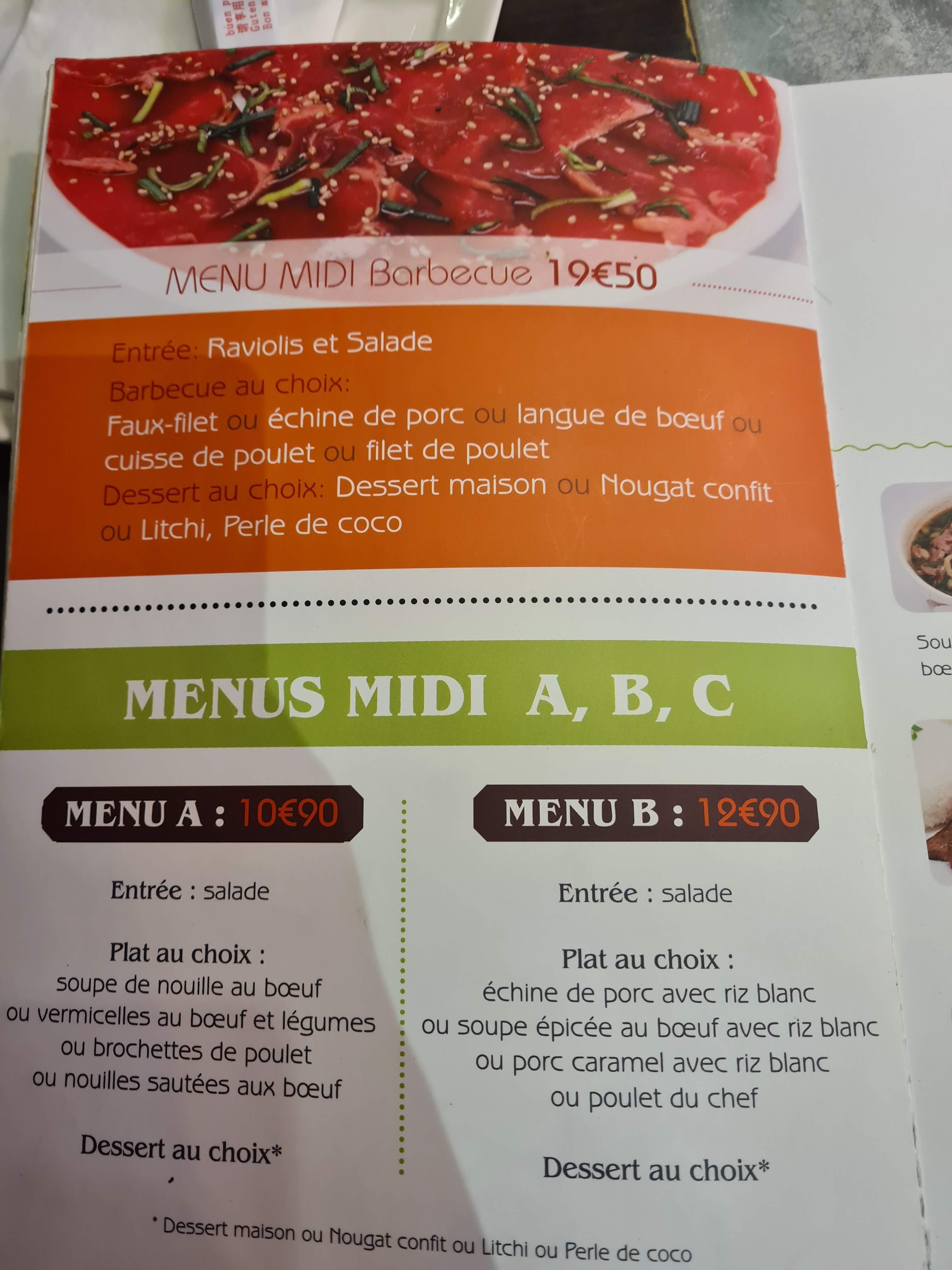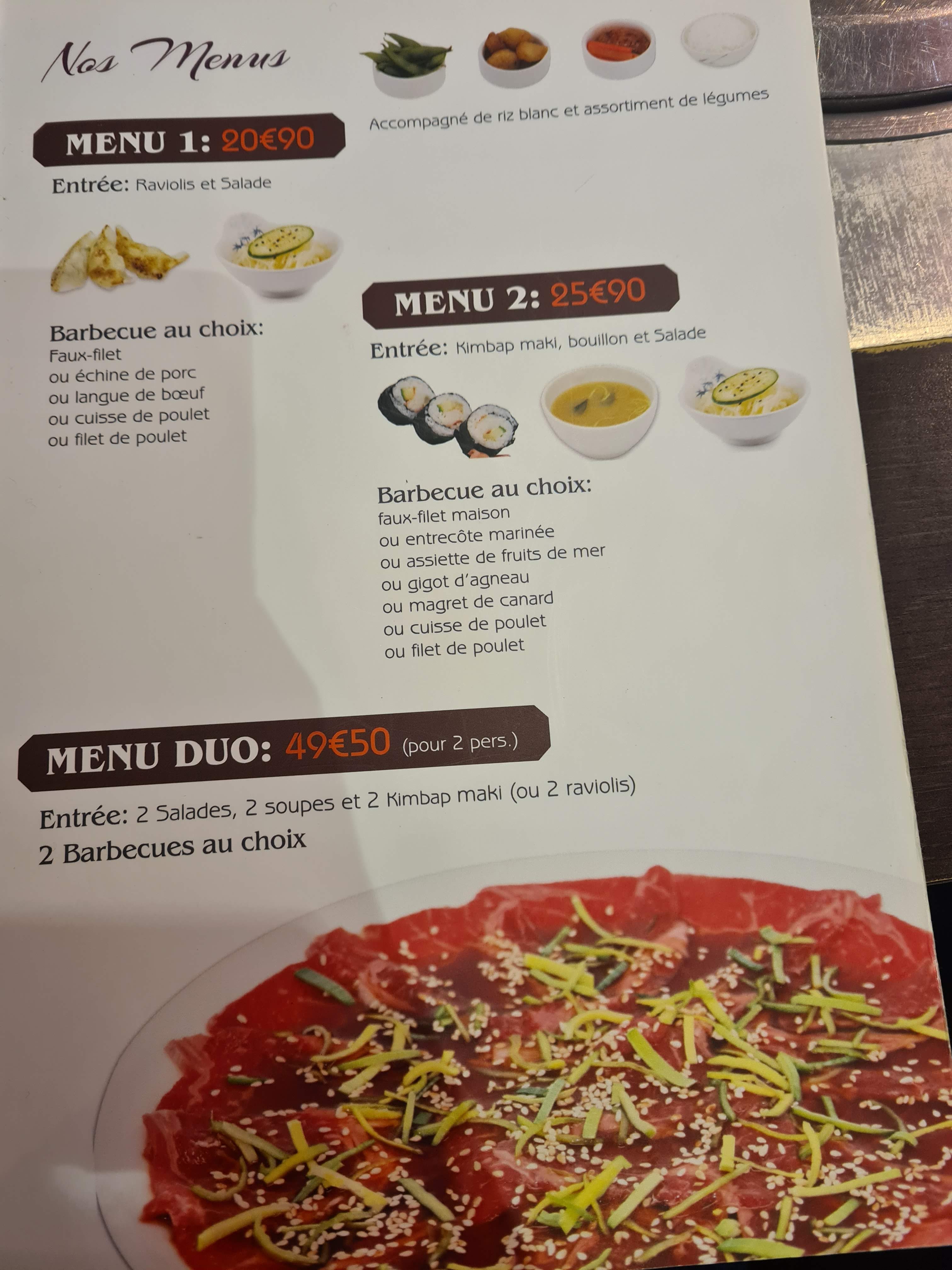 Très jolie restaurant ambiance sympa bonne cuisine le bibimbap est tes bon ainsi que le barbecue Prix très correct le 1er menu le midi est a 19 euros 50 (raviolis barbecue dessert) maxi 25 euros