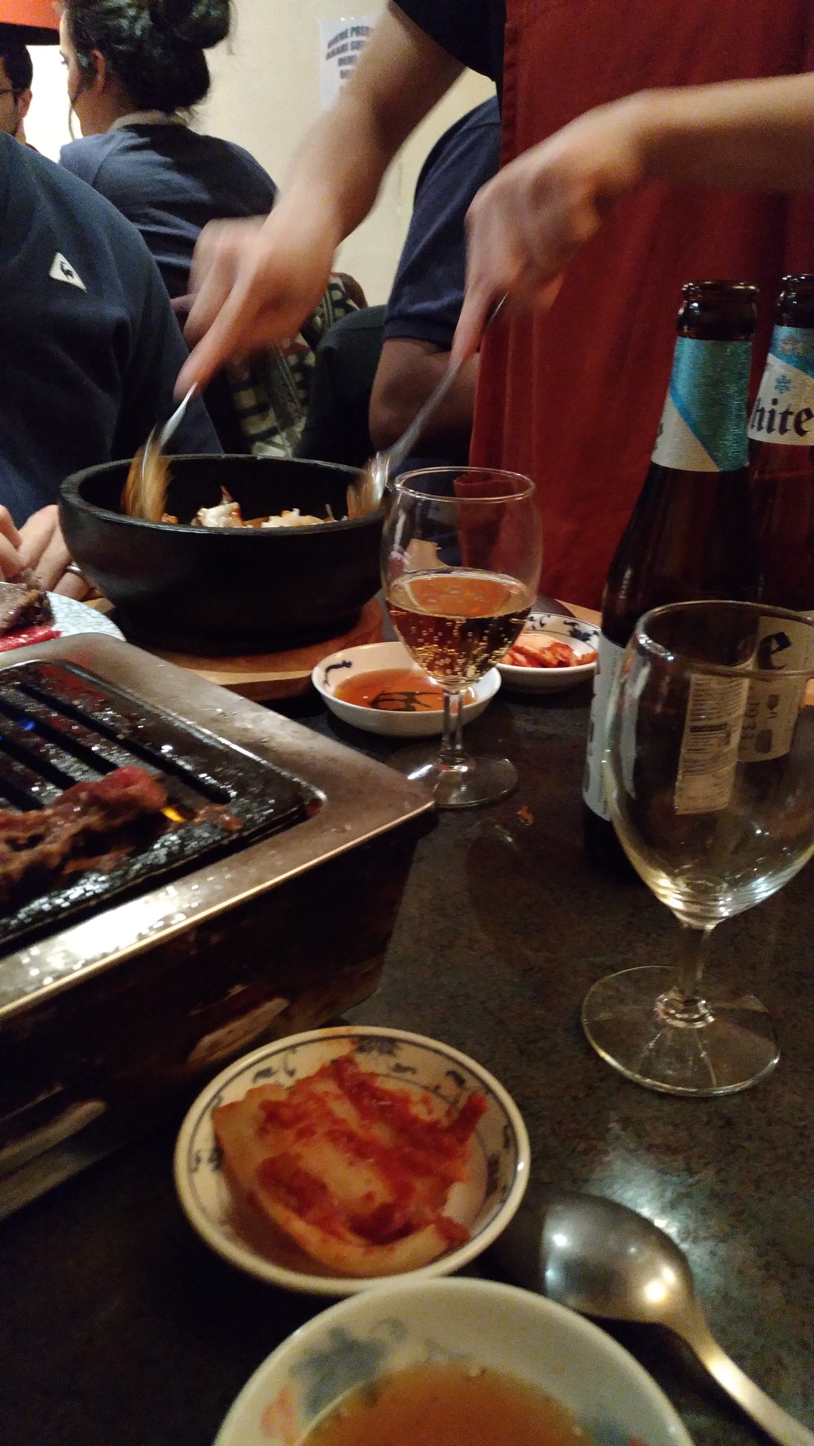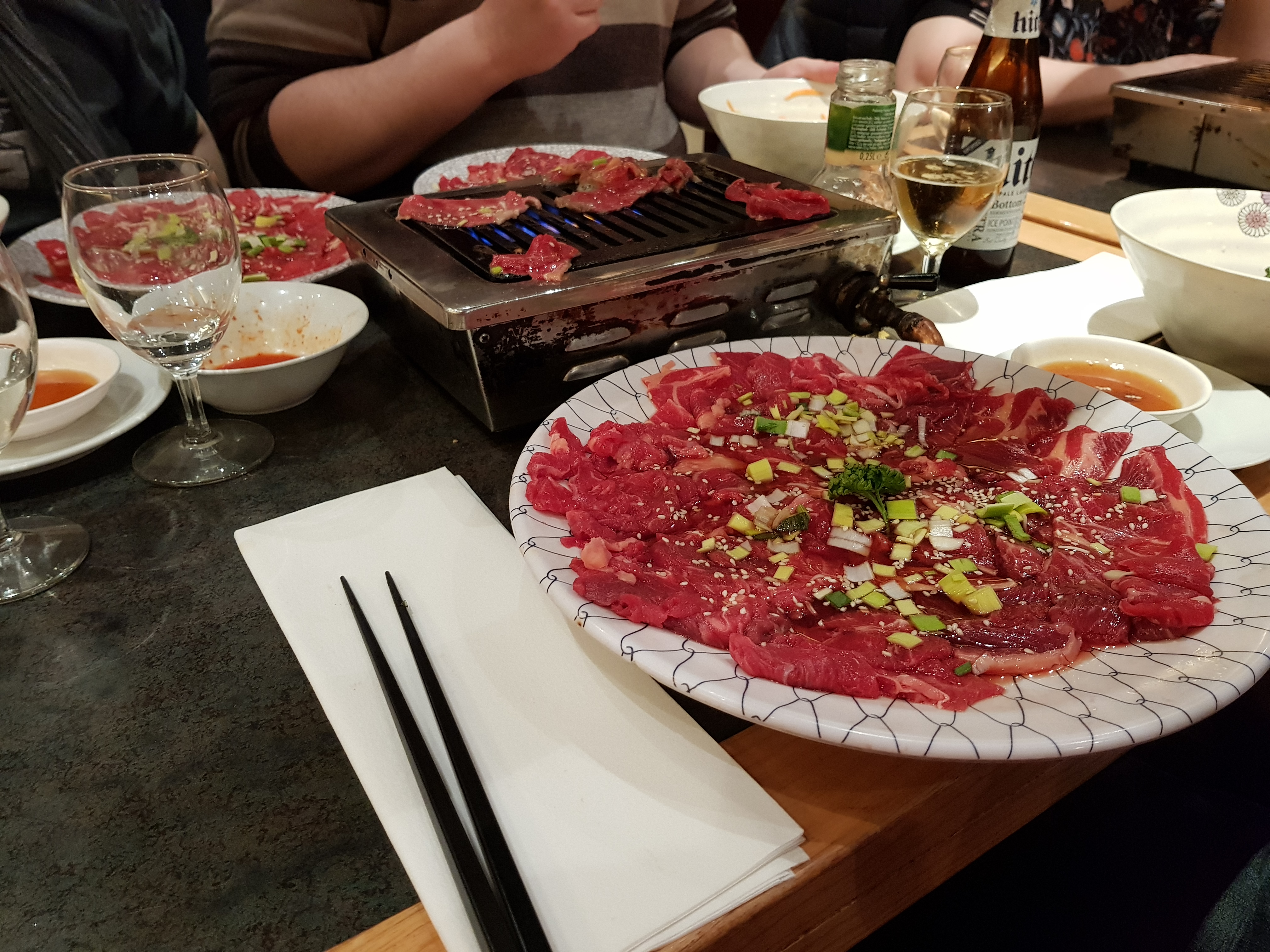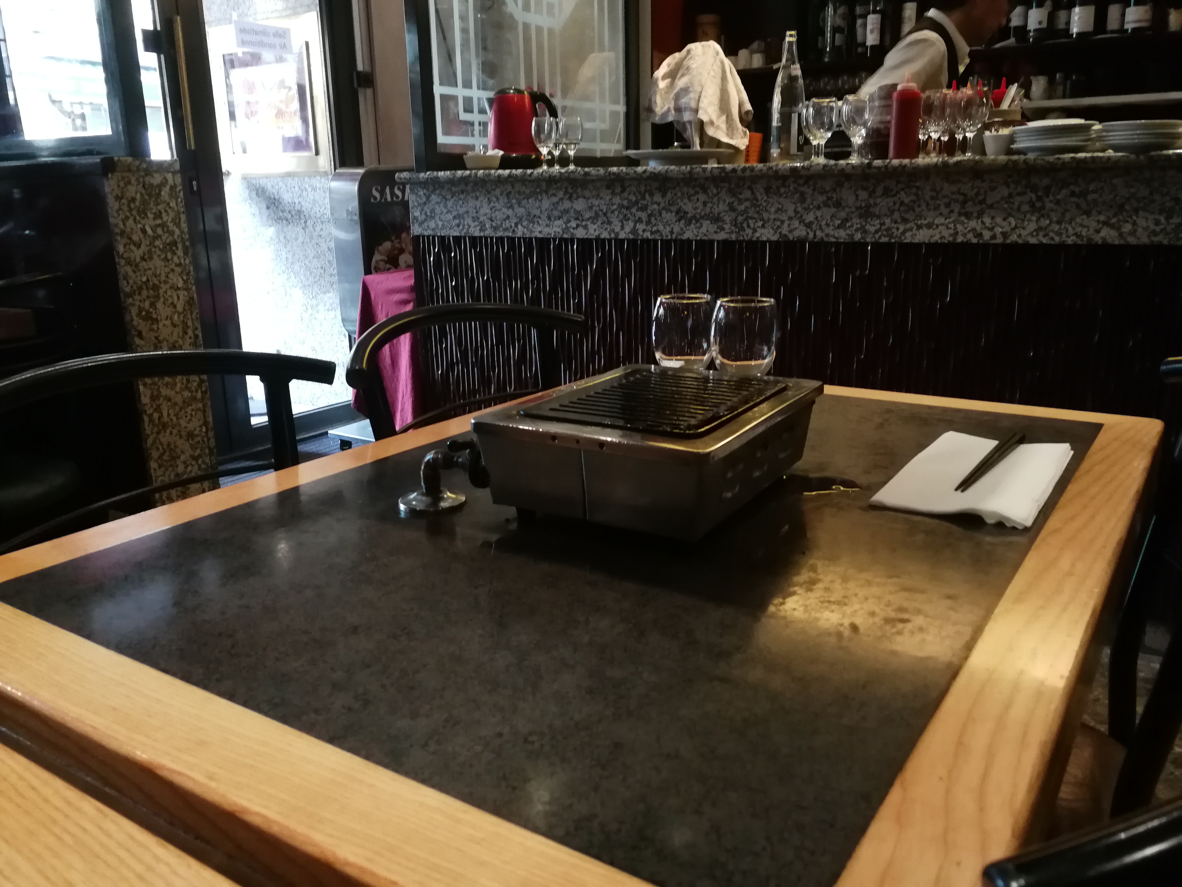 Barbecue Coréen à l’ancienne ! Ici pas de barbecue moderne qui prend toute la table mais un petit barbecue allumé devant nous à la flamme. Service impeccable, le bibimbap est amené a table, on nous demande si l’on désire de la sauce piquante dessus ou pas, puis la serveuse va mélanger elle même le bibimbap, qui est très bon d’ailleurs. Les gyozas sont très bon, la viande et sa marinade également, seul les petits légumes servis au début sont un peu fade. La viande est coupé très fines, et il serait vraiment bien qu’on ai une pince spéciale pour pouvoir l’attraper plutôt que les baguettes qui ne sont pas super pratique pour mettre la viande sur le grill.