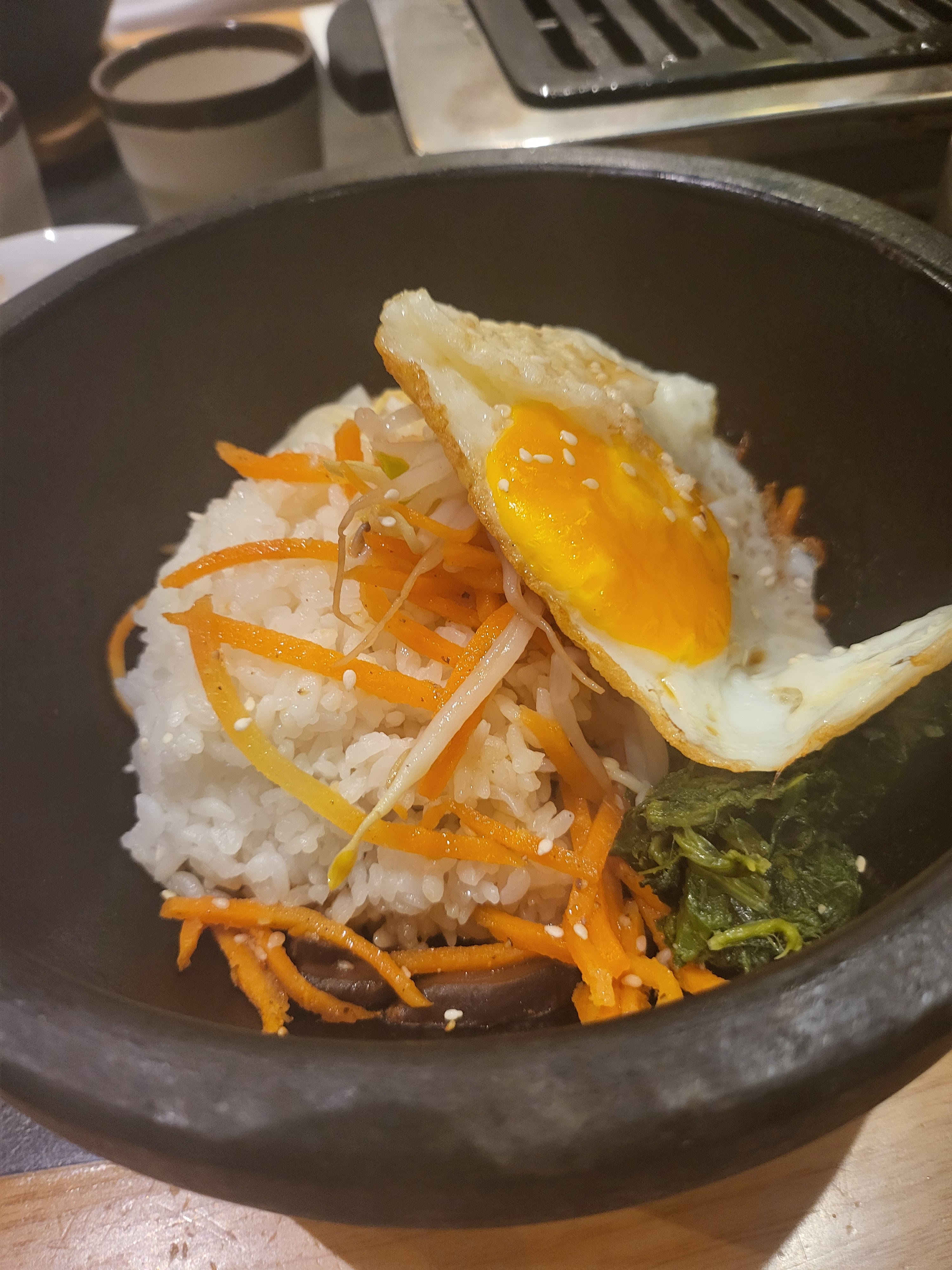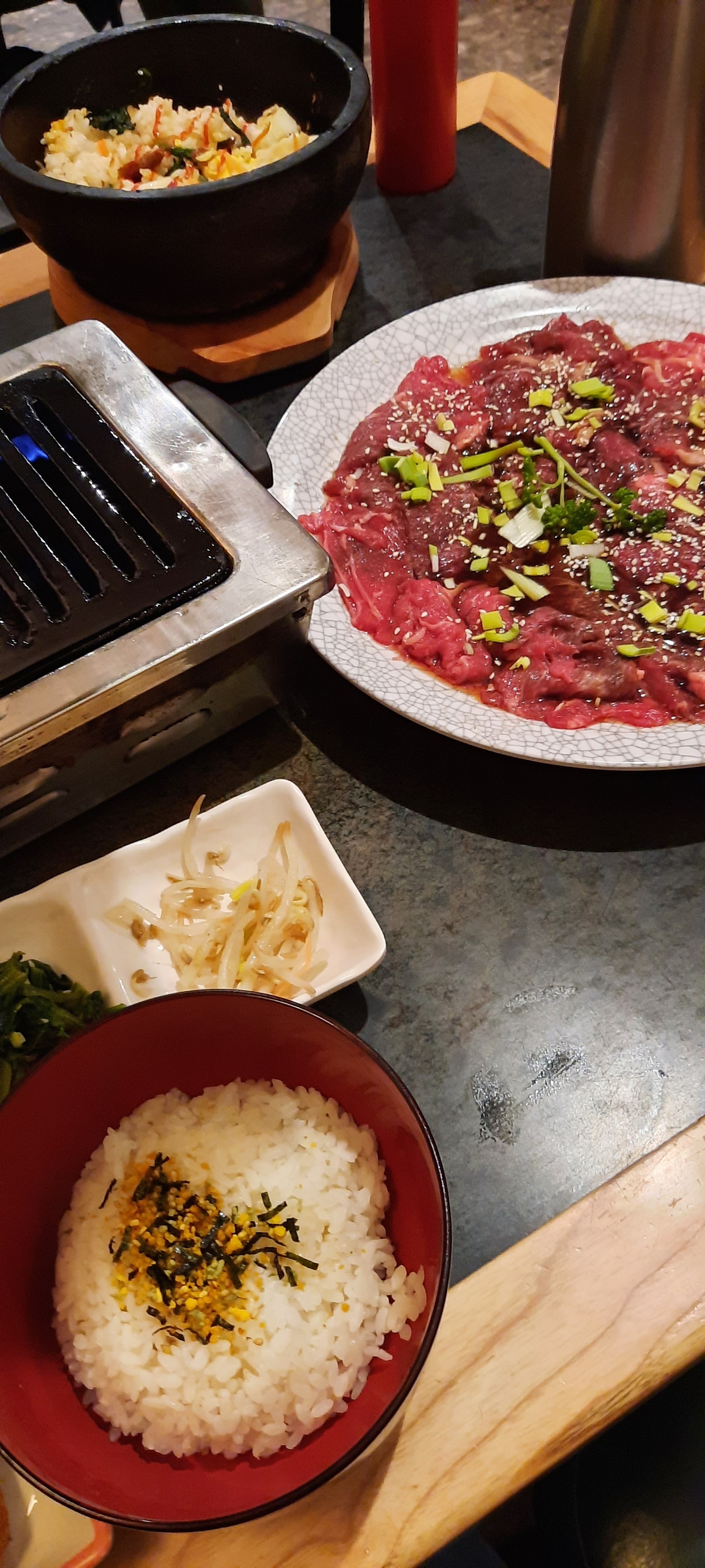Notre expérience dans ce restaurant a été mitigée. L'endroit est plutôt étroit, avec une salle à l'avant et une autre à l'arrière qui est envahie par la fumée des barbecues. Nous avons opté pour le menu BBQ et avons trouvé les gyozas excellents, les petits légumes assez fades, et la viande très bonne. Cependant, le bibimbap manquait de saveurs, et l'œuf était trop cuit (Un œuf sur le plat)cela aurait été plus savoureux s'il avait été servi cru. Pour améliorer l'expérience, il pourrait être bénéfique d'avoir à disposition une petite pince pour prendre la viande, un détail qui ferait toute la différence, surtout lorsque la viande est coupée aussi finement. Le service était minimaliste, se limitant au strict minimum