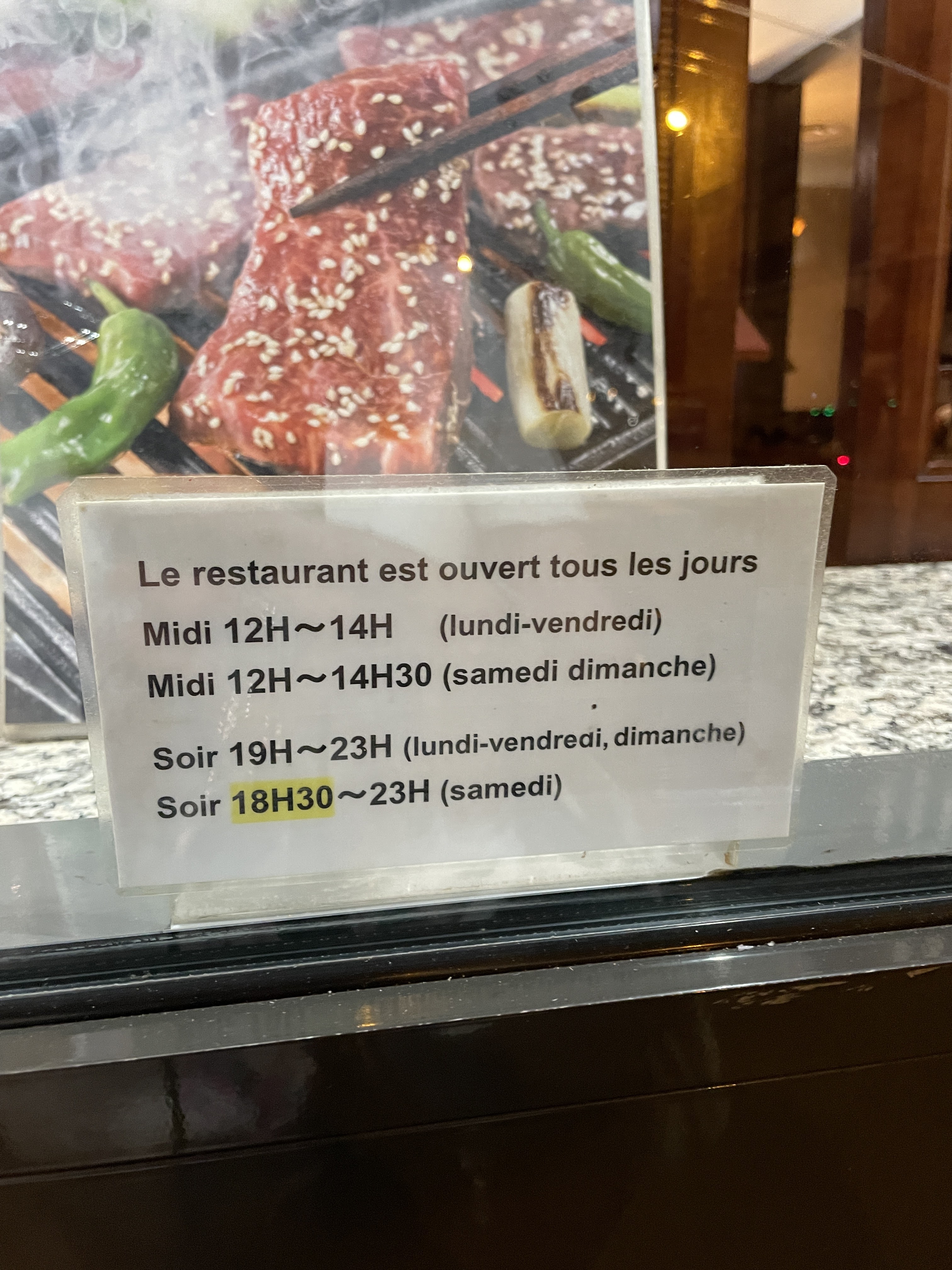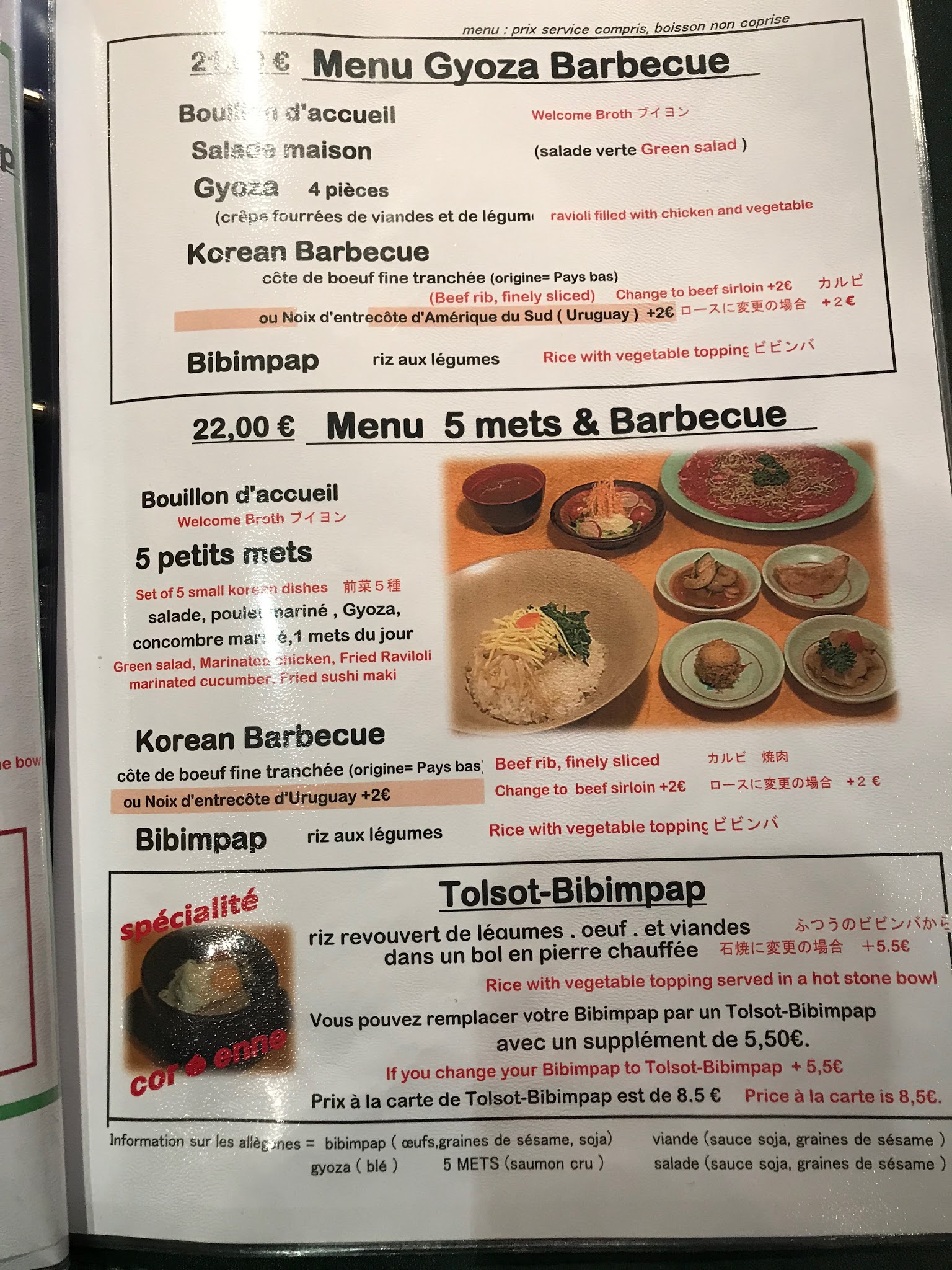 Le patron est en fait japonais… et le menu est en français, anglais et japonais sauf coréen. Le style de barbecue est tout à fait japonais aussi. Le seul plat coréen est bibimbap. Si vous voulez manger du bœuf KOBE vous êtes dans le bon endroit mdr