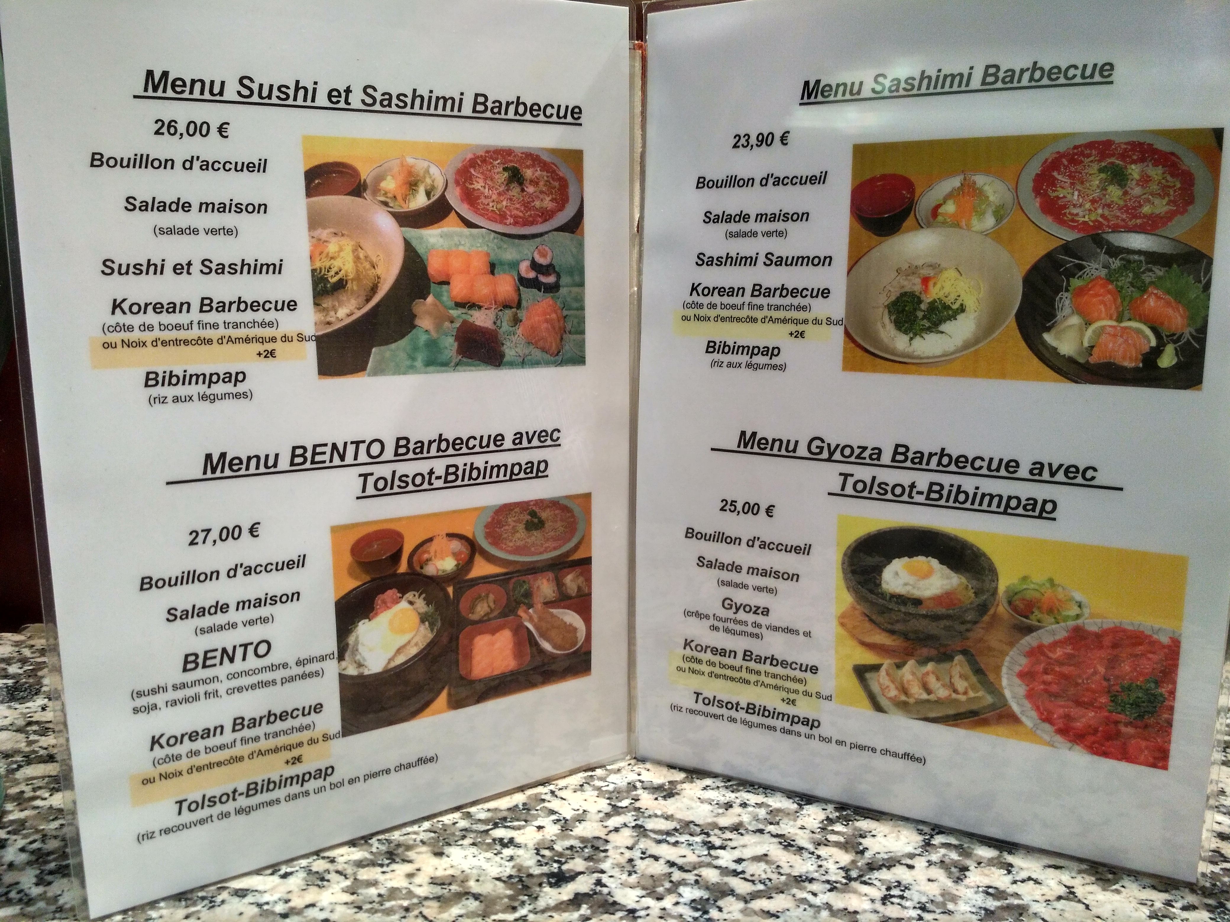 Je le retiens surtout car ma moitié me trouvait très sévère sur mon évaluation. Il faut dire que nous y déjeunons régulièrement avec ses enfants et je reconnais que l'endroit est pratique, le service est rapide et souriant. Alors, entre les crèperies indigestes et les japonais de pacotille qui entourent la gare Montparnasse, pourquoi pas un barbecue coréen ? Celui-ci est loin d'être le pire de Paris. On peut même dire que les portions, le goût et le choix sont convenables. Et surtout une très bonne aération ! Fondamental pour ne pas faire le bonheur de son pressing le soir même. Il y a, comme toujours dans ce style d'endroit un très large choix de menus aux noms fabuleusement originaux comme Spécial coréen, Gyoza Barbecue ou Sushi Barbecue ! Je me promets, à la prochaine visite, de tester pour vous la spécialité Tolsot-Bibimpap (à vos souhaits !) ainsi que les boissons coréennes.