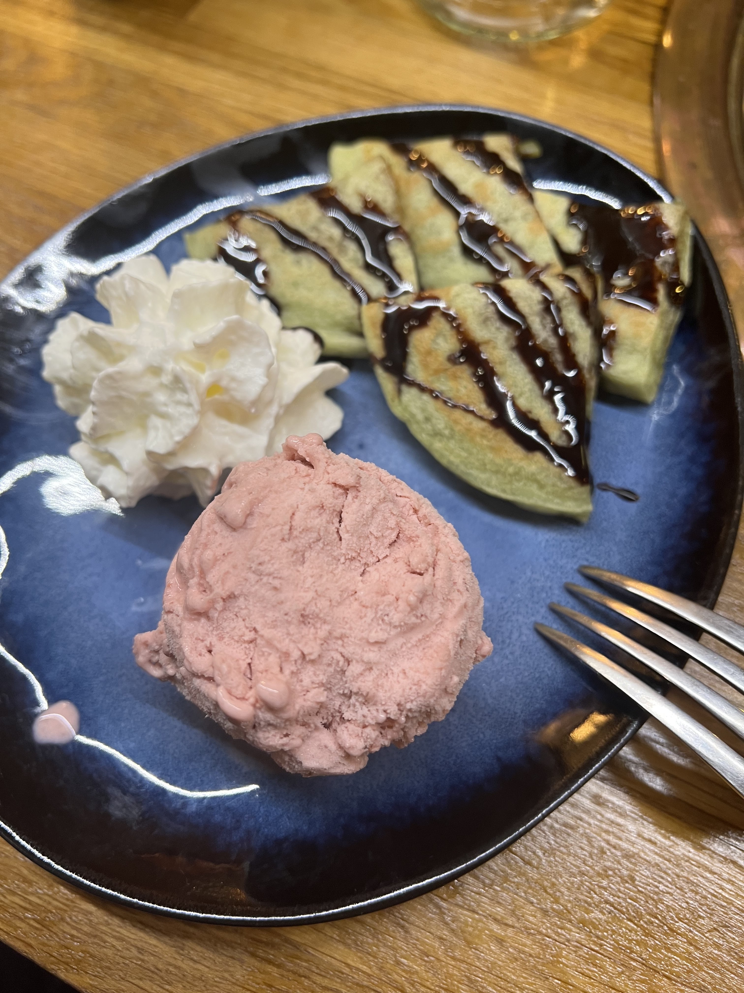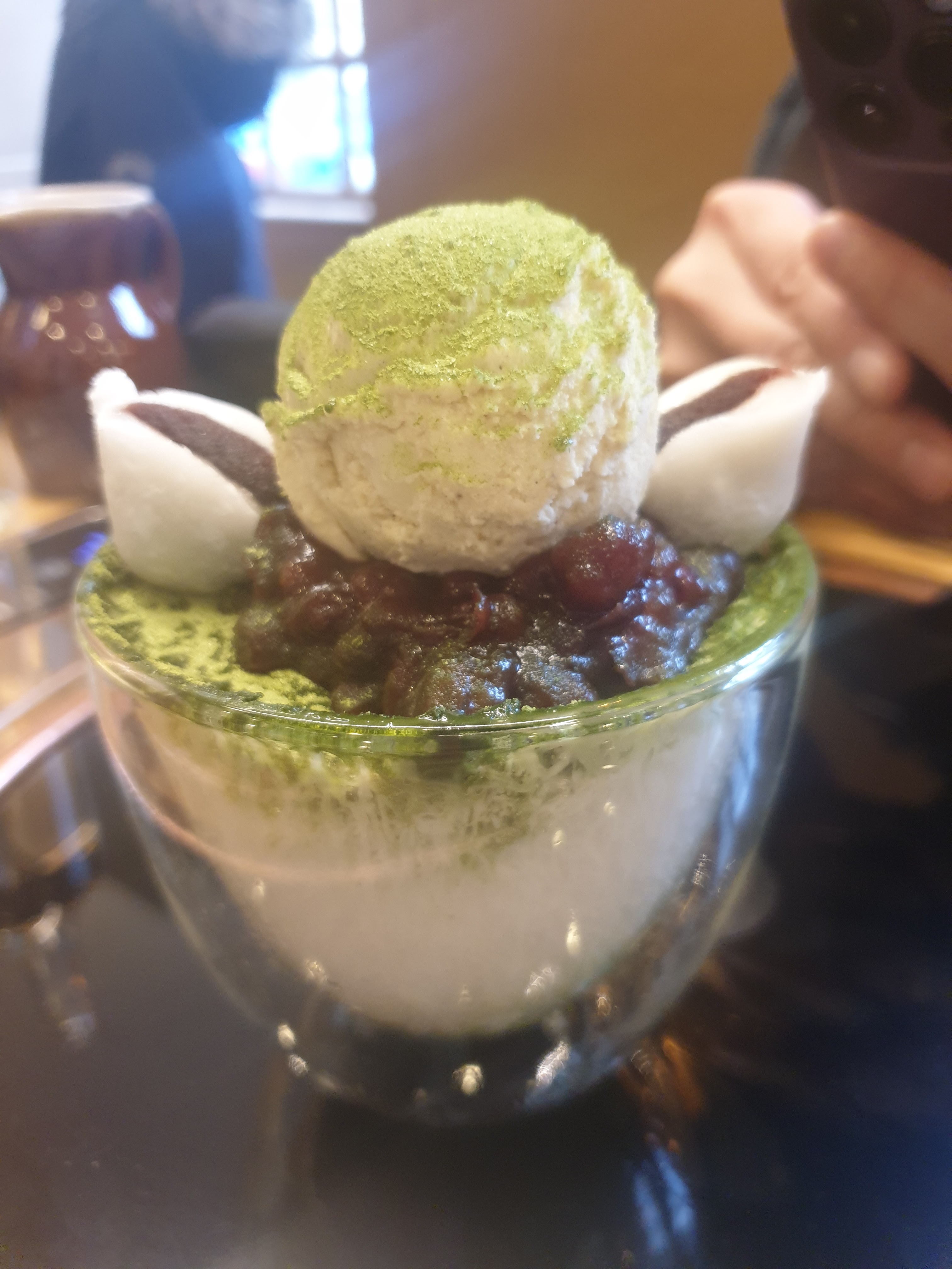 Très bon cette fondue aux bœuf et champignons et très très très très très copieux. Il ne vaut mieux pas prendre d'entrée quand on prend ce plat là. C'est l'occasion de manger des champignons coréens et même le bouillon est très bon. J'ai eu la chance grâce à mon amie E. connaisseuse de goûter avec ma boule de glace au thé matcha de la glace aux haricots rouges. Les deux étaient délicieuses. Merci aux serveuses également.