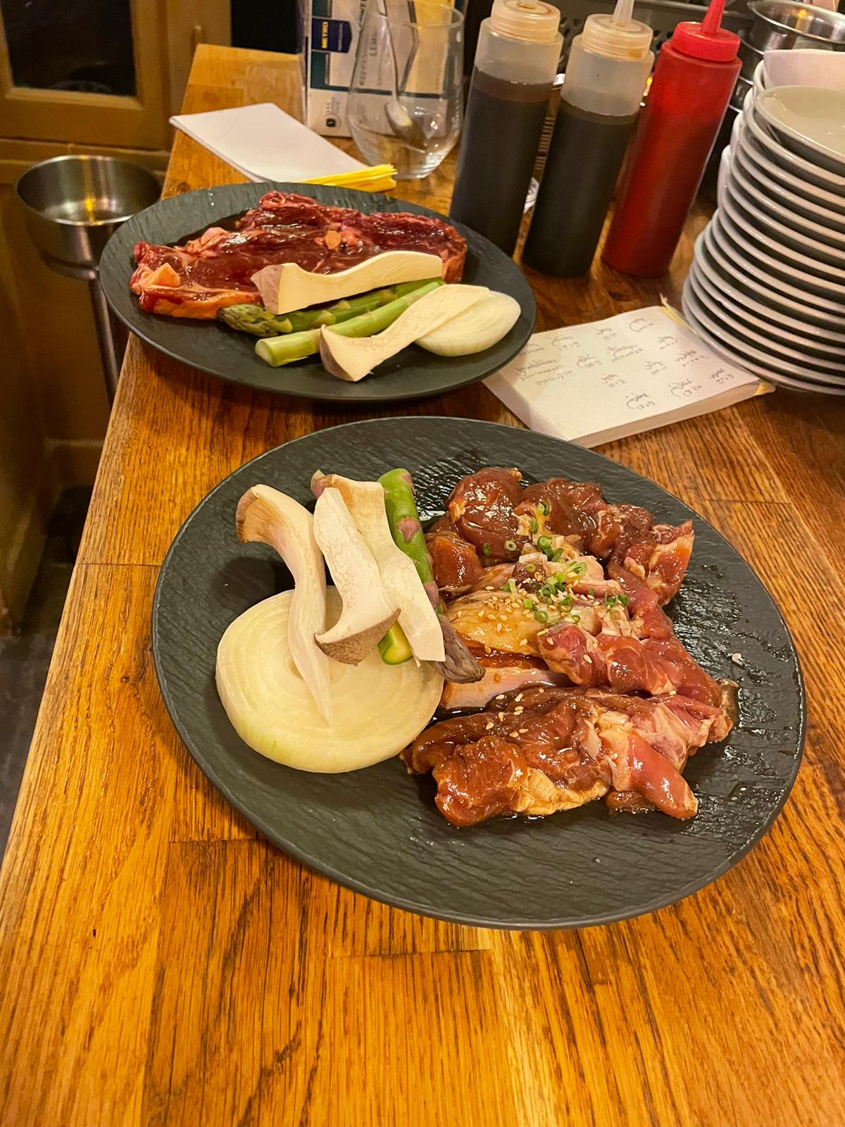 Deux morceaux de bœuf un peu gras qui arrivent et là, la magie s'installe: ça grille, c'est découpé par la serveuse et on mange... La viande a un très bon goût et on sent qu'elle est marinée, elle est tendre et tout part en moins de 10 minutes. Un peu radin sur les accompagnements et une addition un poil cher mais on passe un bon moment et on mange bien.