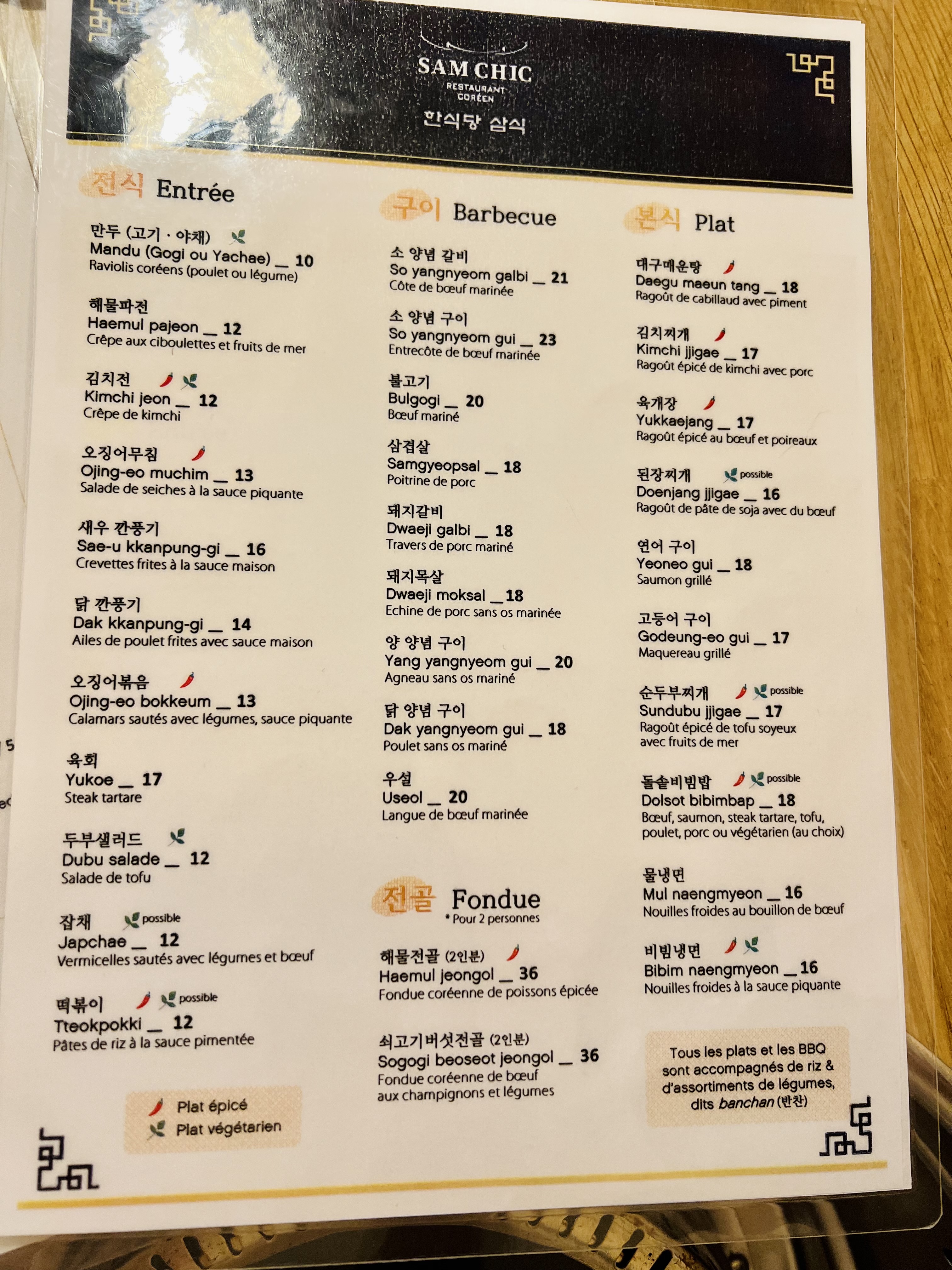 Très bon dîner chez Sam Chic, testés et approuvés en entrée les raviolis coréens, et la basse côte de boeuf marinée. Les serveurs sont accueillants, de bons conseils et nous apprennent volontier comment manger comme en Corée.