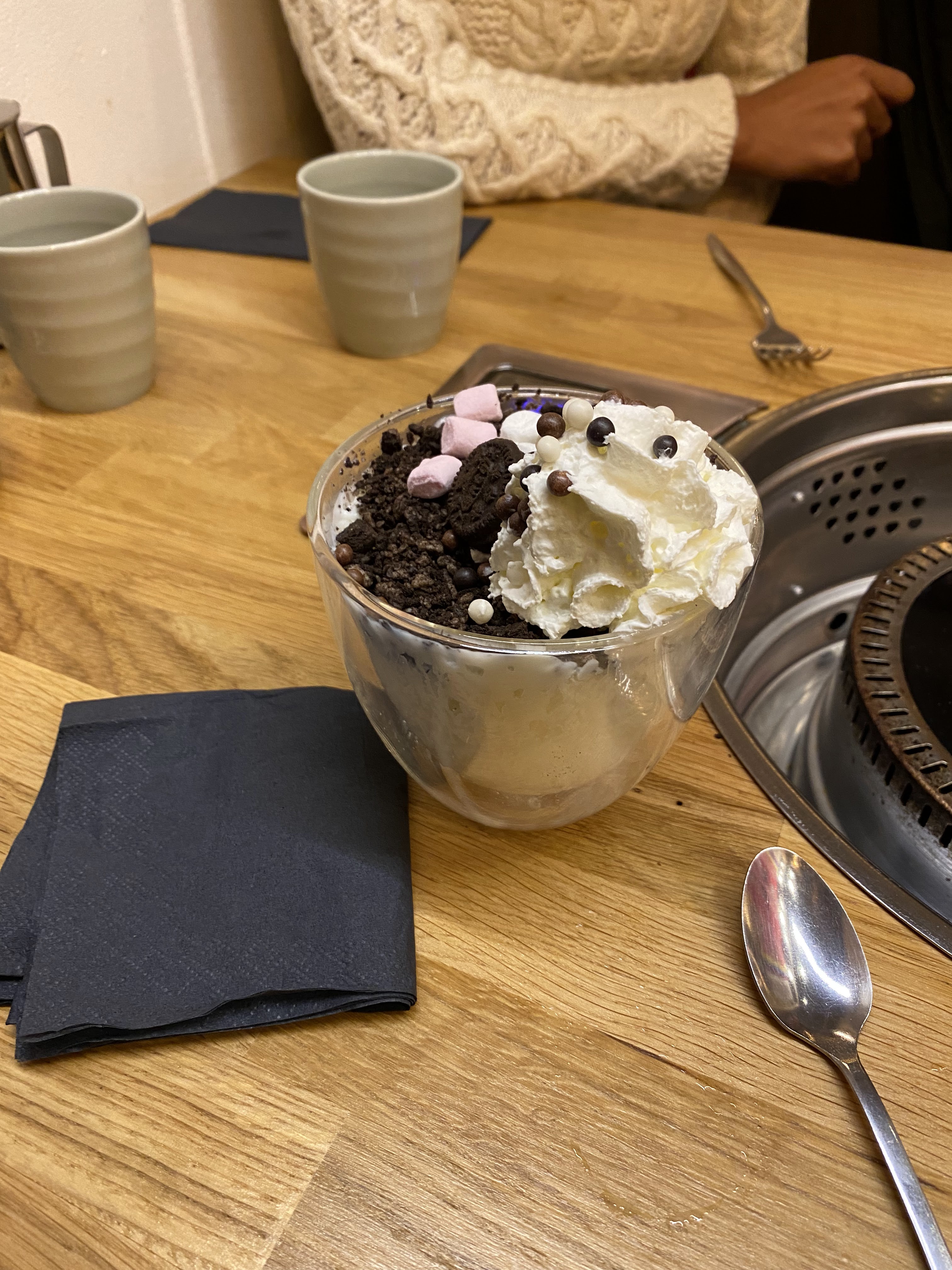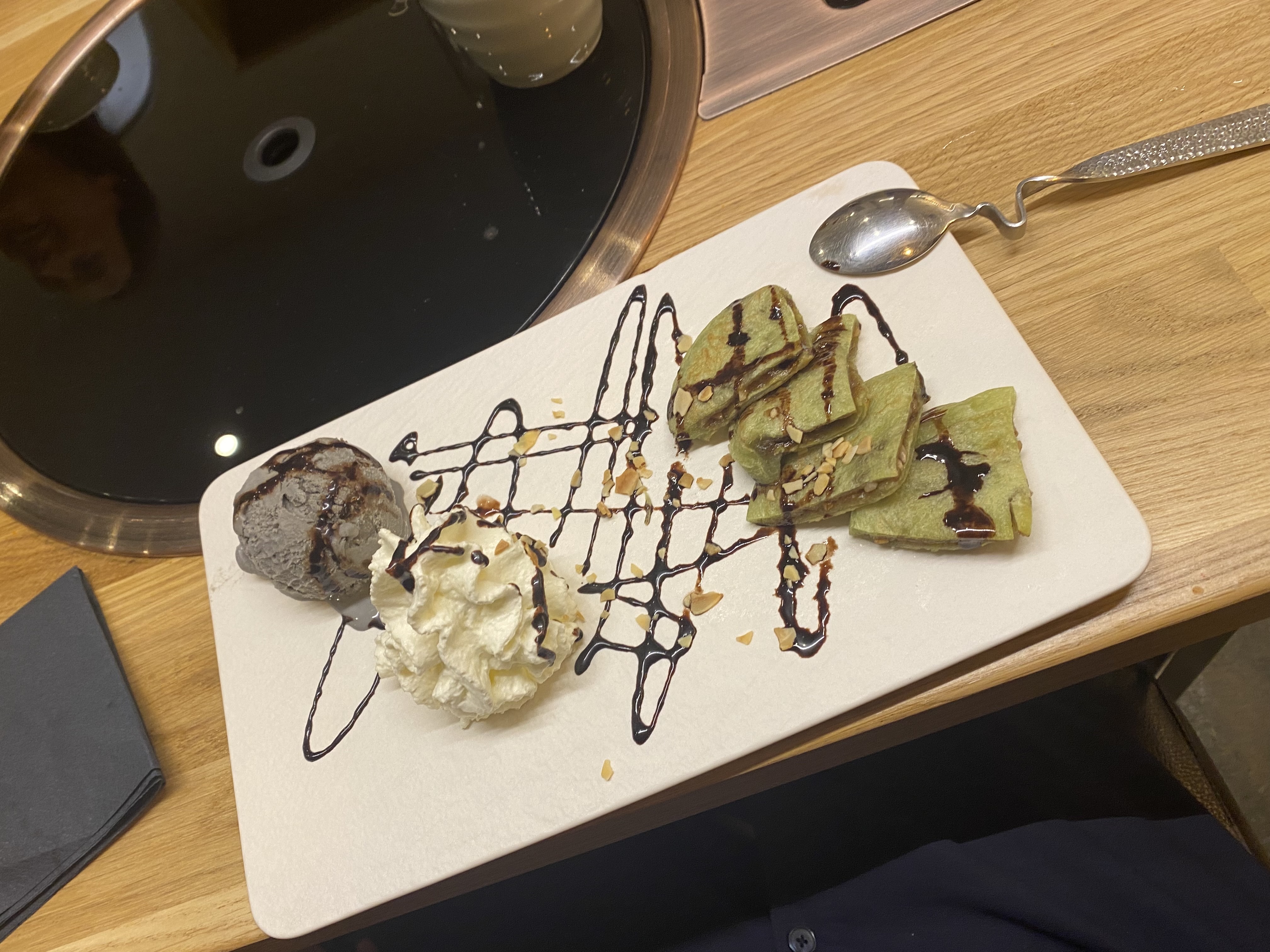 Super bon rien a redire une fondue coréenne a faire exploser le ventre 🤩 très bon et en grosse quantité pour 2. Barbecue la viande est super tendre. Le dessert de la glace pilé avec une glace et haricot rouge très original