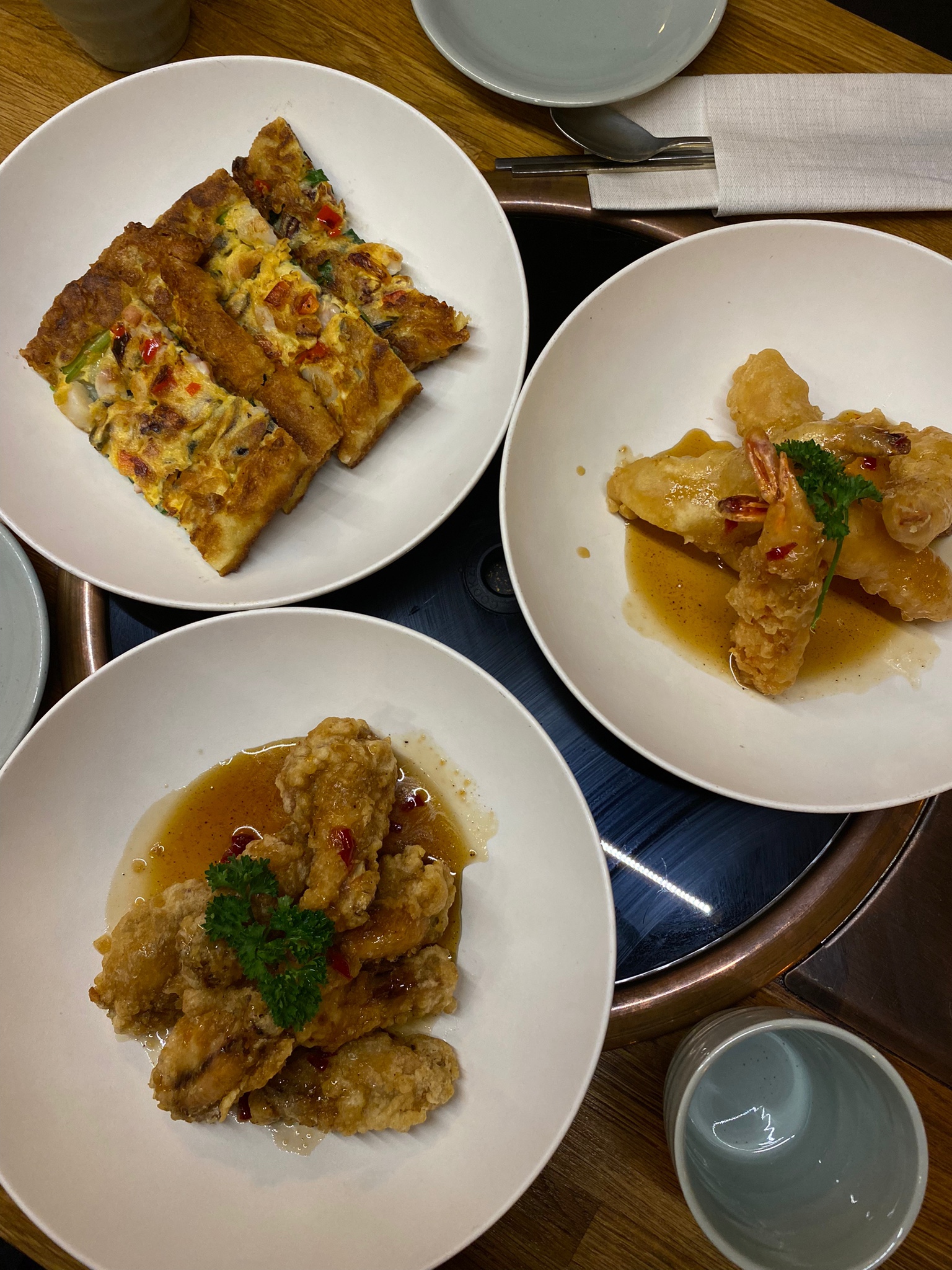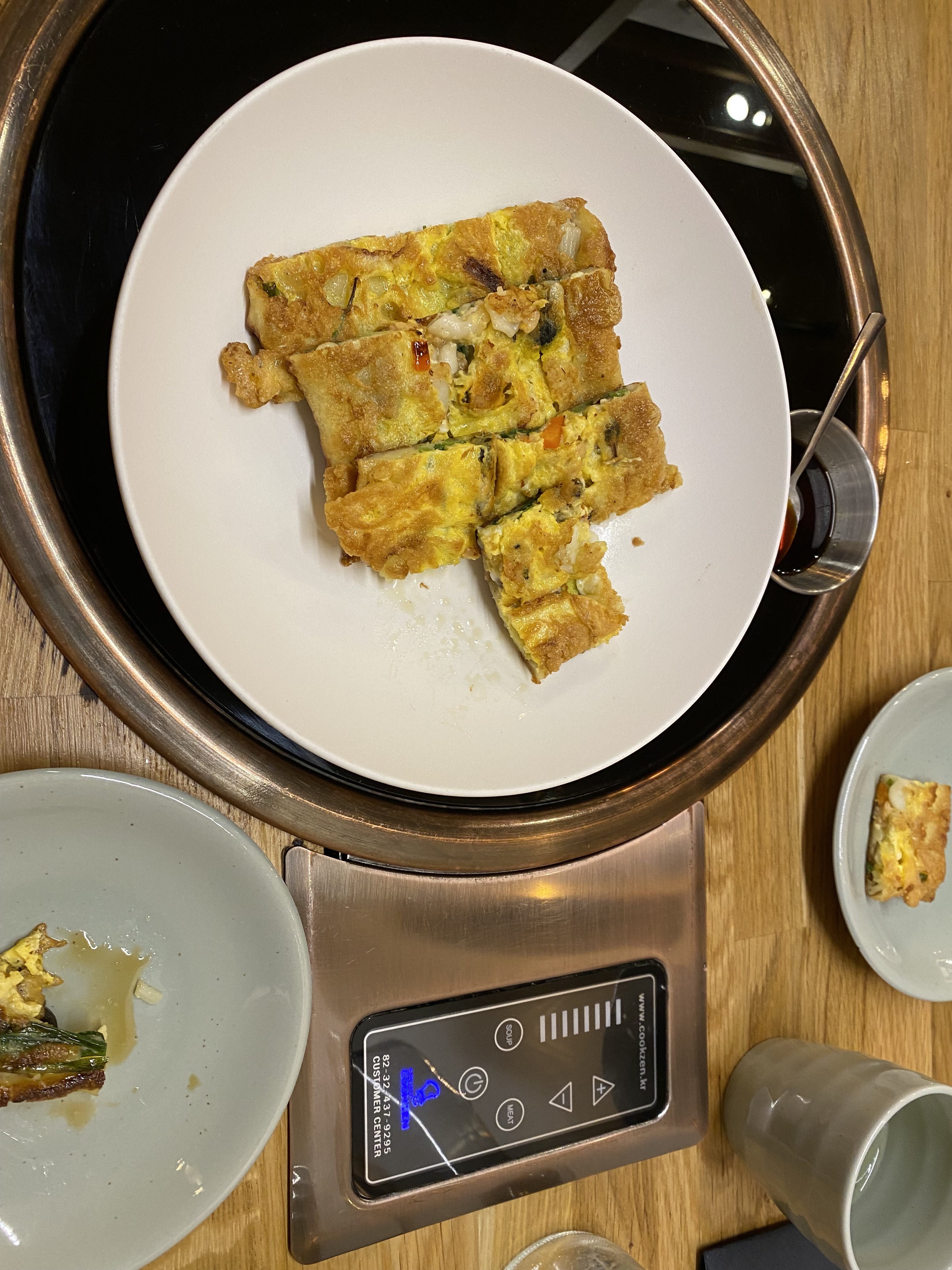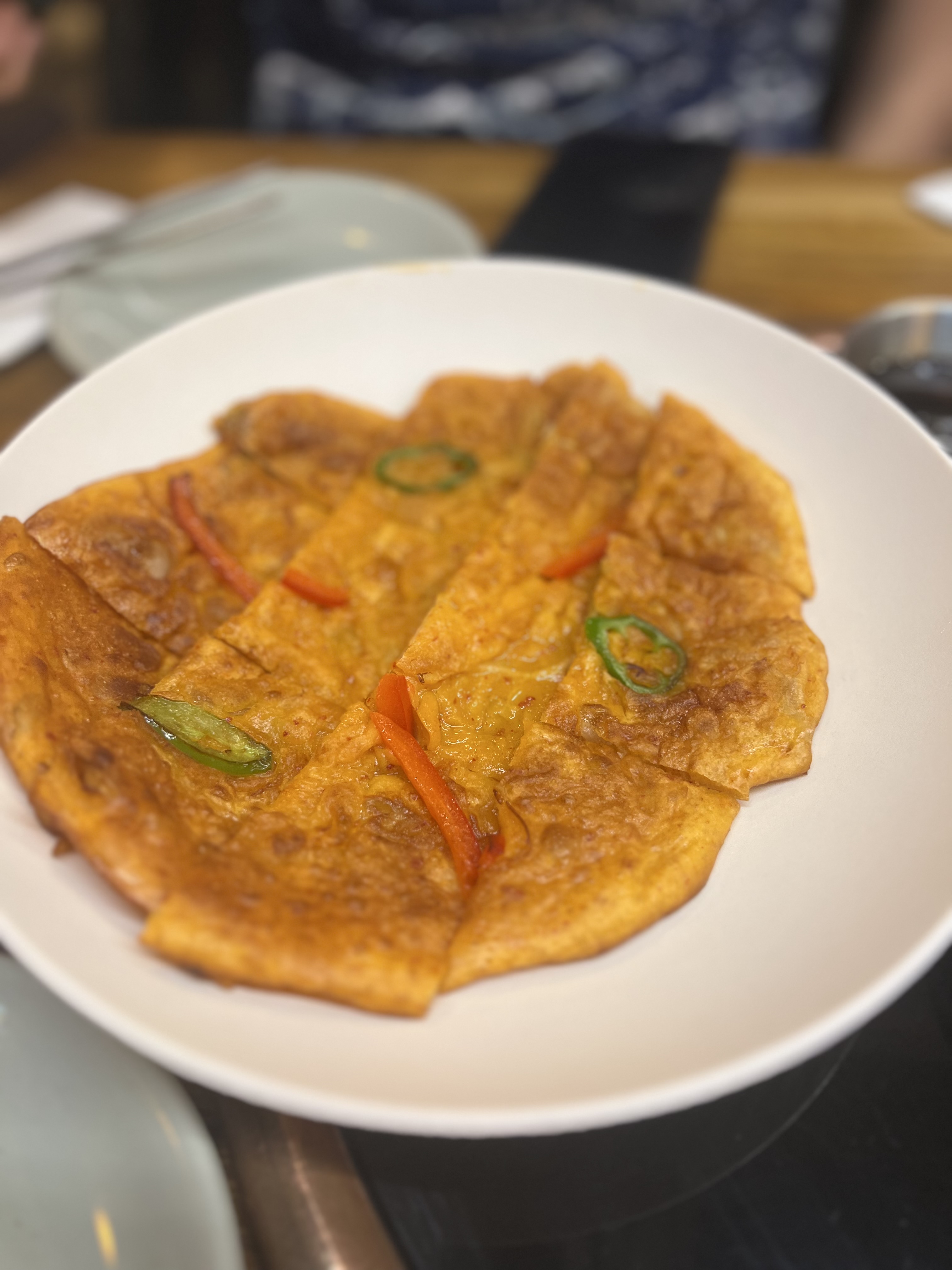 Nous avons réservé en semaine. Notre table était à l'étage près d'une fenêtre agréable et assez calme très peu de monde, ça s'est rempli très vite. Le cadre est très épuré, très agréable. Lorsque nous sommes partis énormément de monde, au RDC très bruyant. Le restaurant est très grand. Les limonades citrons et prunes sont très rafraichissantes et bon goût. Les galettes de kimchi très bonnes, et celle au fruit de mer très parfumées. Nous nous sommes rendus dans ce restaurant pour le hotteok très très bon.