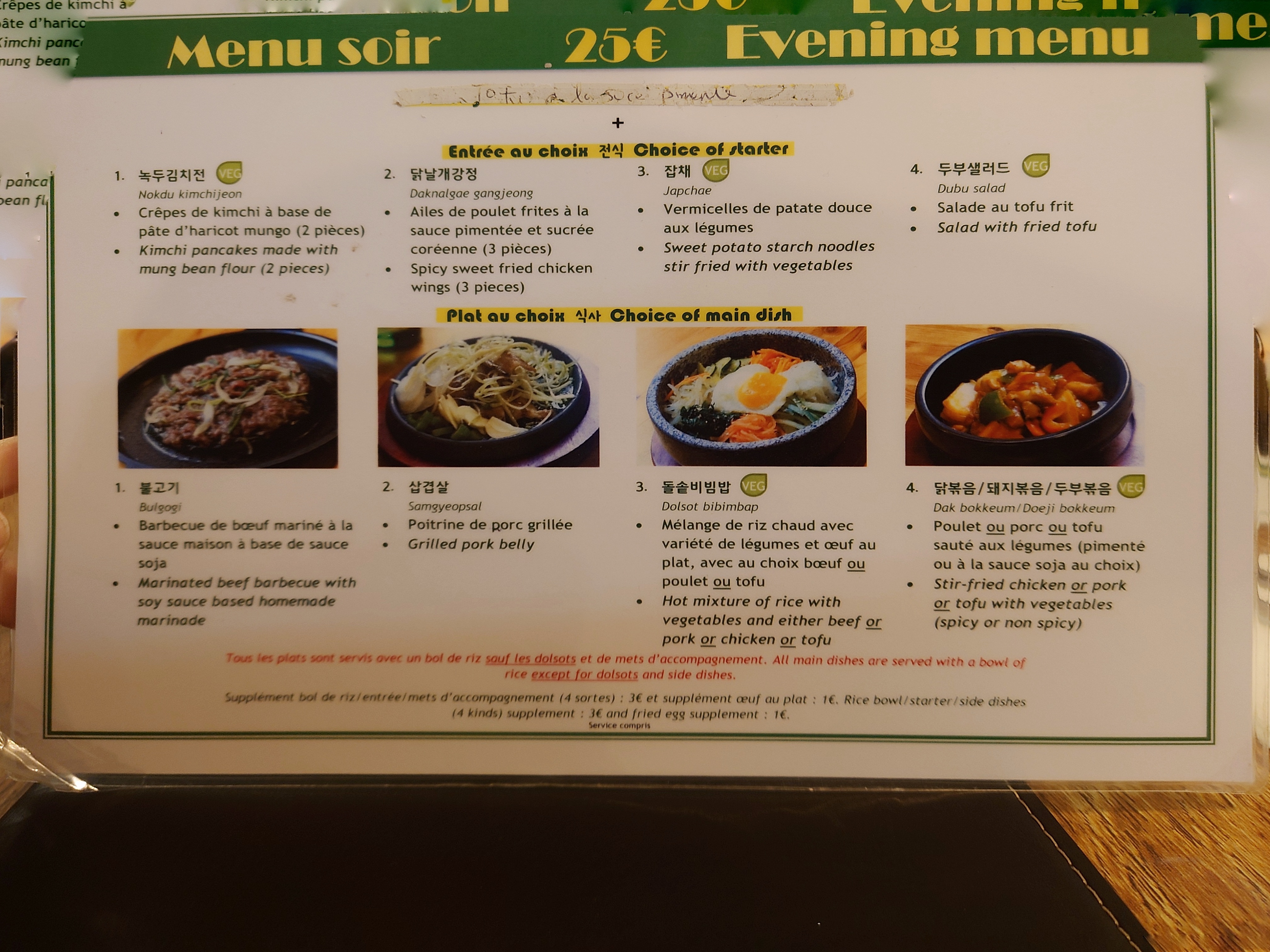 Changement de propriétaire depuis peu. Grosse déception. Pas de menu, pas d'accompagnement (kimchi, haricots, cacahuètes etc). Bibimbap assez petit, riz trop cuit et qui ne gratine pas dans le bol.